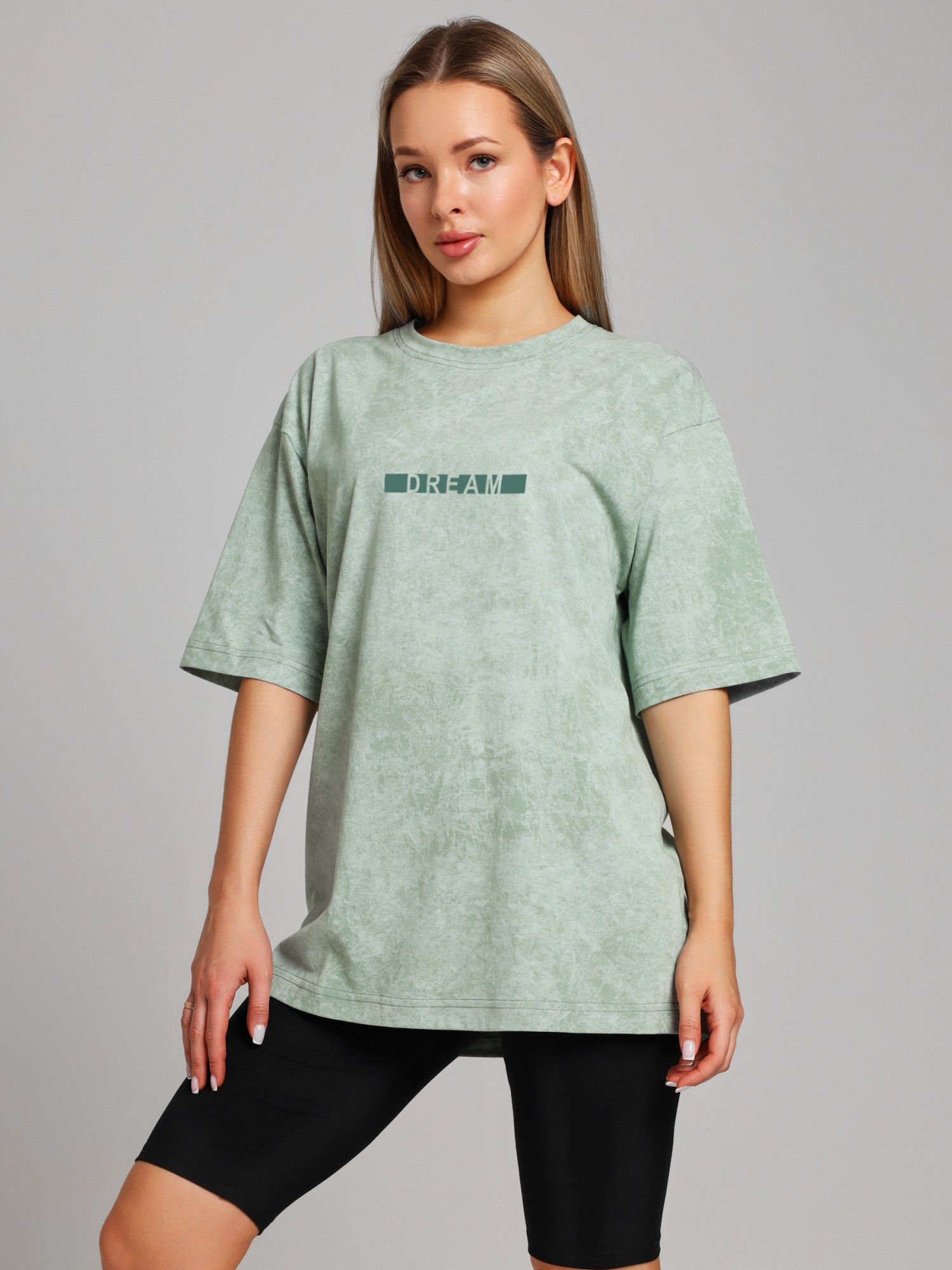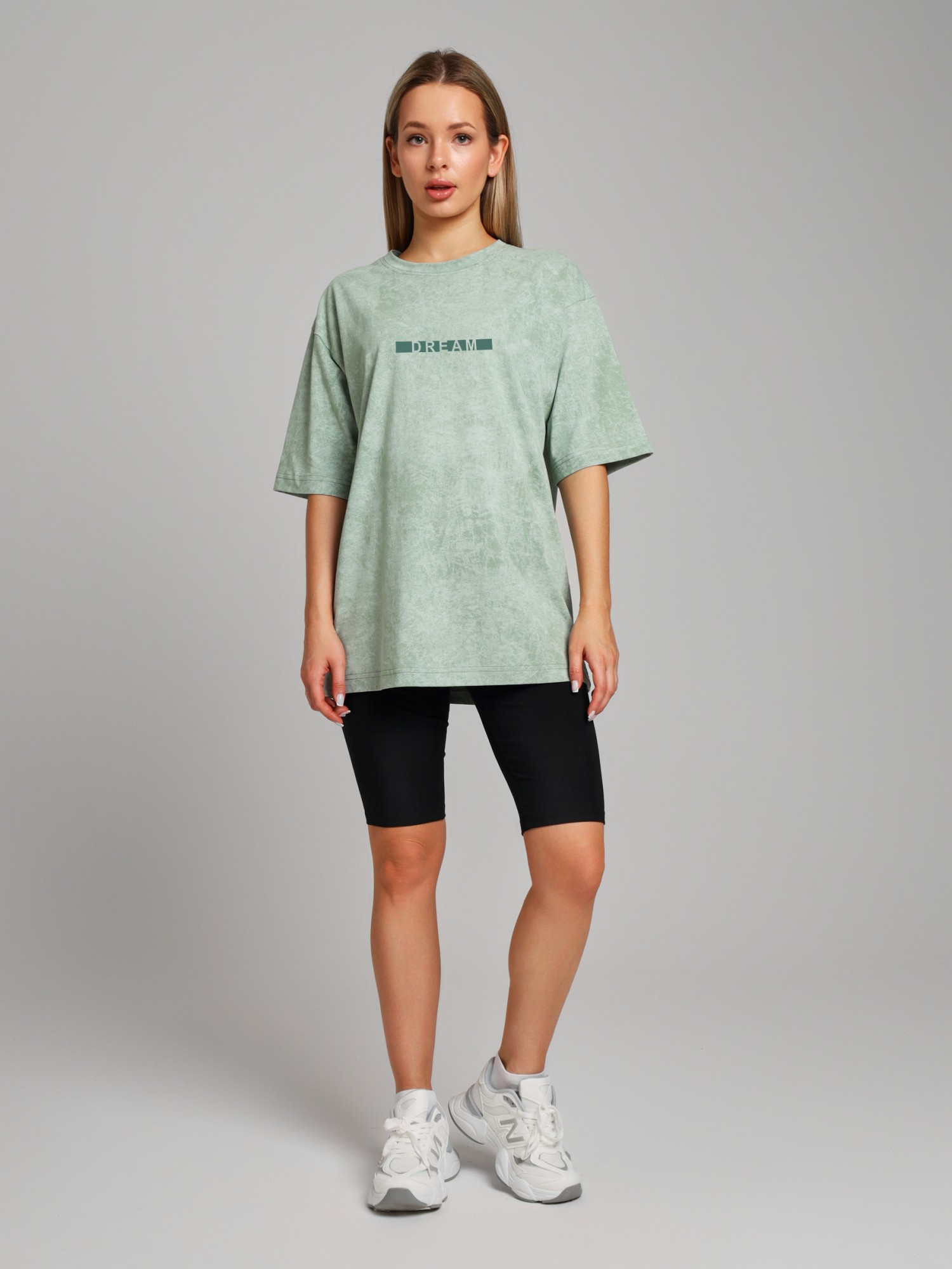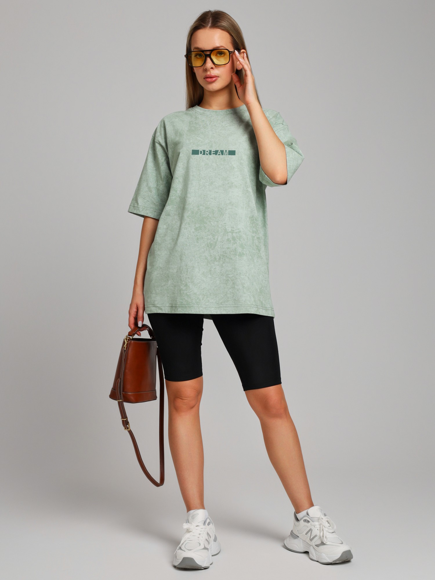 Футболка женская из трикотажного полотна "кулирка-варенка", с удлиненными плечевыми швами, втачными короткими рукавами, горловиной овальной формы, обработанной втачной планкой, и принтом на детали переда, выполненным в технике шелкографии. По горловине изделия настрочена отделочная строчка.
