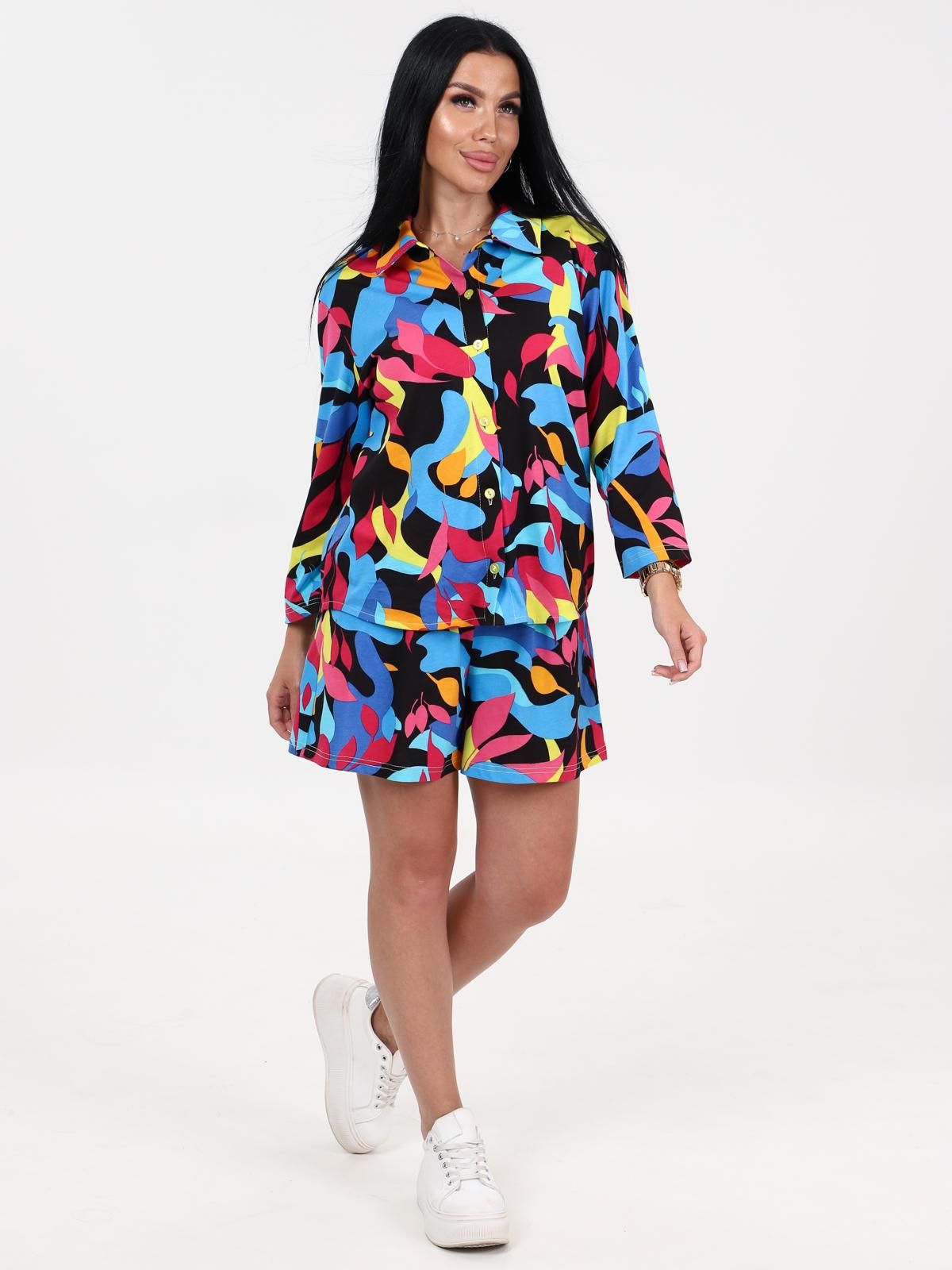 Костюм Фивея из набивного трикотажного полотна "кулирка" состоит из блузы-рубашки и шорт. Блуза - свободного покроя с удлиненной спинкой, с втачными рукавами длиной 7/8, отложным воротником и центральной бортовой застежкой на петли и пуговицы. Шорты - свободные, слегка расширенные книзу, средней длины, с карманами в боковых швах, на притачном поясе с эластичной лентой внутри.