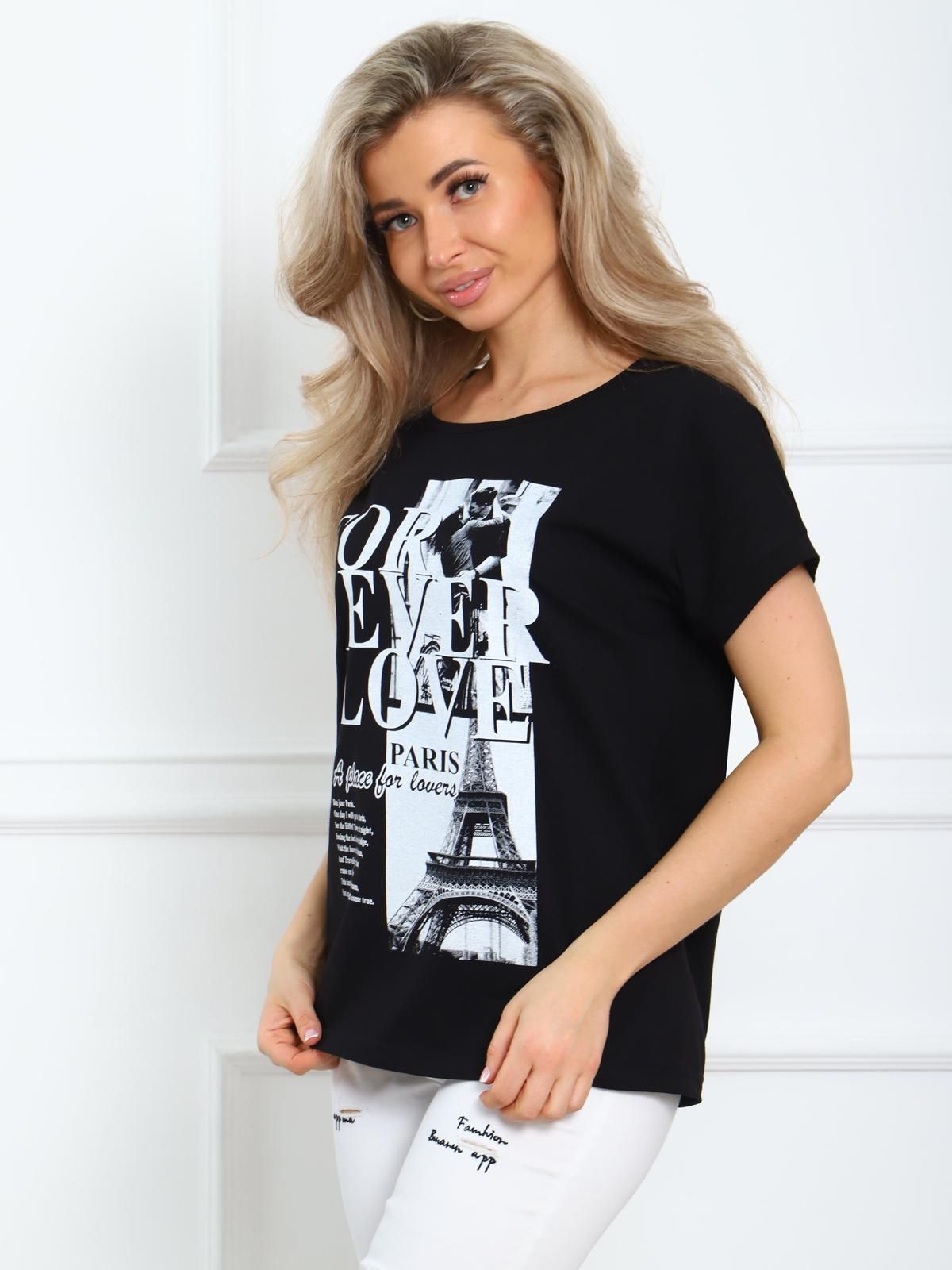 Футболка женская из натурального трикотажа. Свободный крой позволяет носить его на разные типы фигур. Мягкие линии делают эту модель очень женственной. Горловина круглой формы. Спущенная линия плеч. Низ изделия прямой. По центру нанесен принт, шелкография.