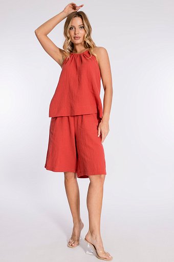 Топ свободного силуэта выполнен из хлопкового полотна - муслина. В кулиску вставлен шнур, при помощи которого можно регулировать длину бретелей.