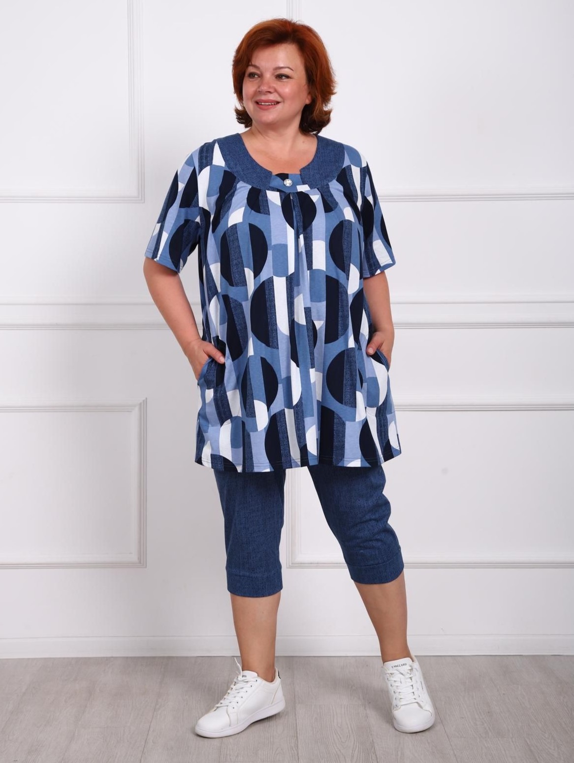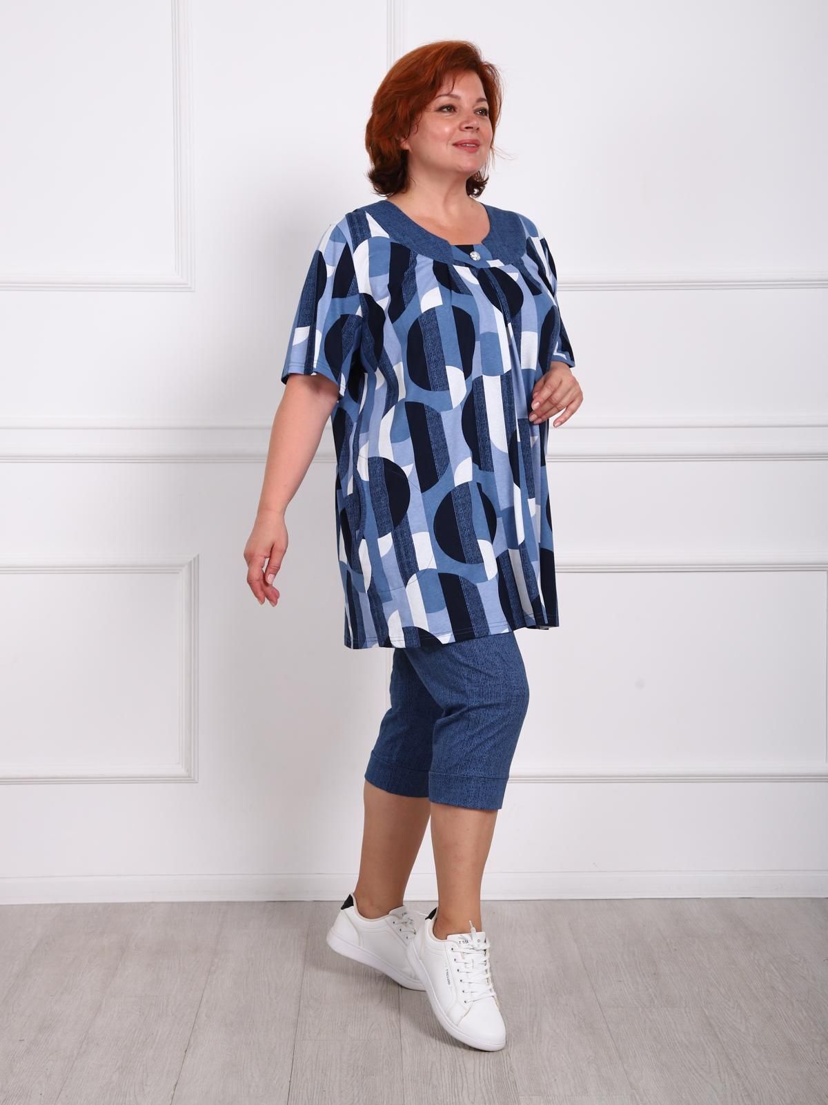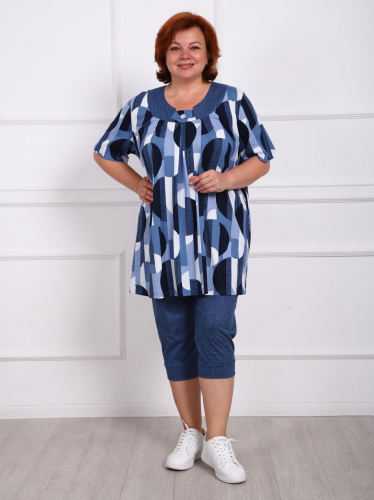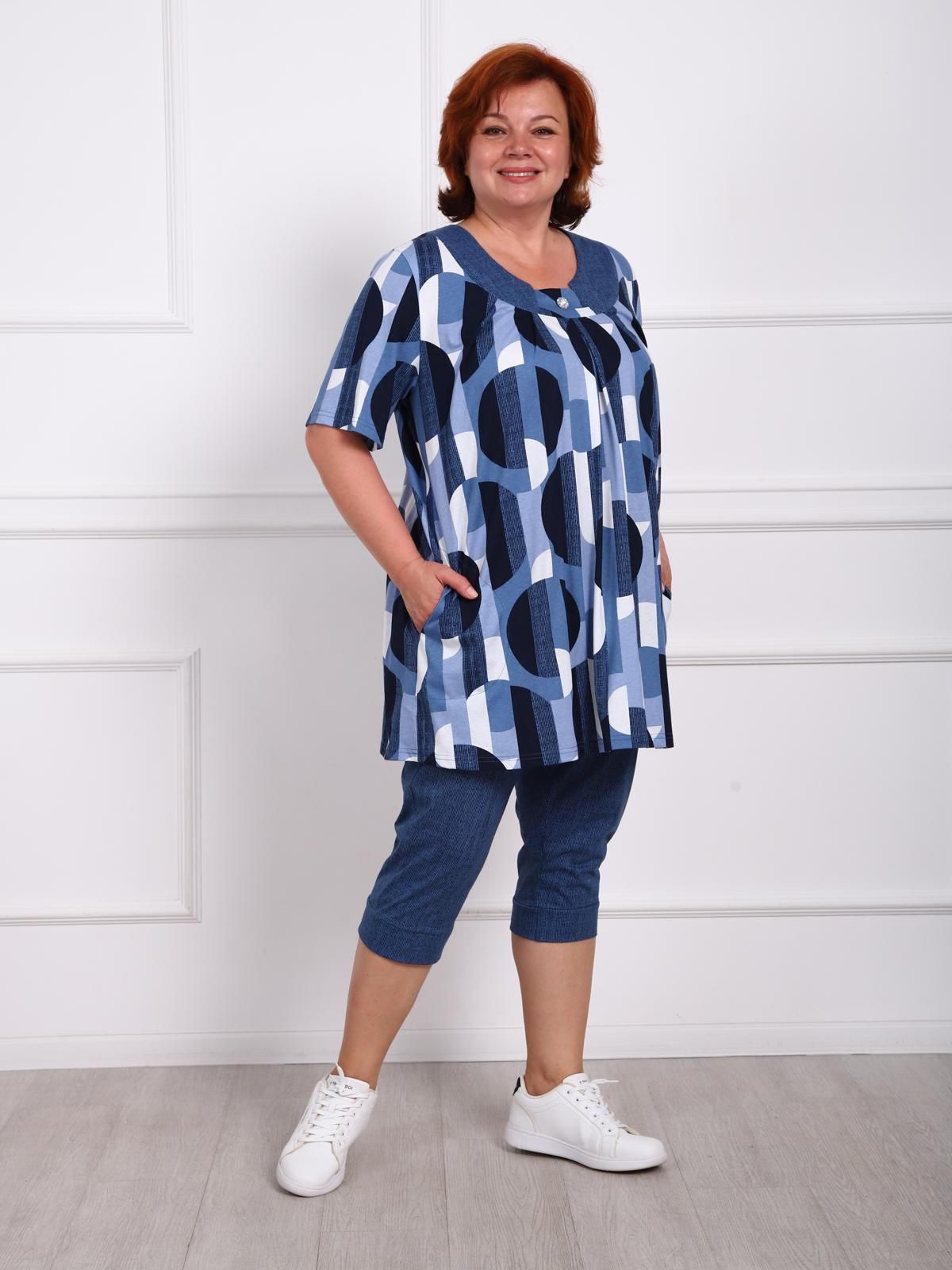 Костюм женский больших размеров состоит из туники и бридж. Туника прямого силуэта  по переду имеются складки, в боковых швах карманы. Бриджи высокой посадки, длиной до середины икры.