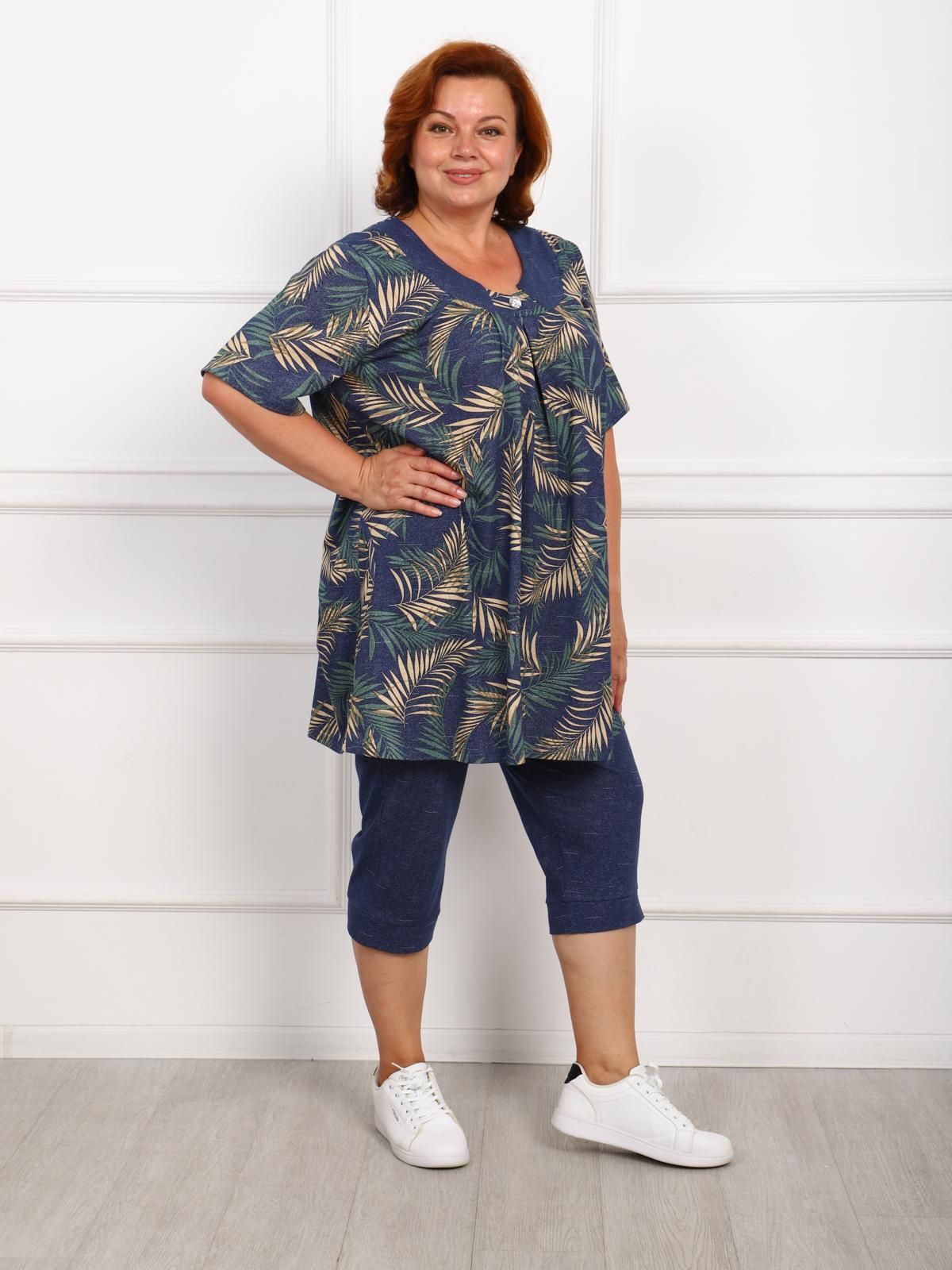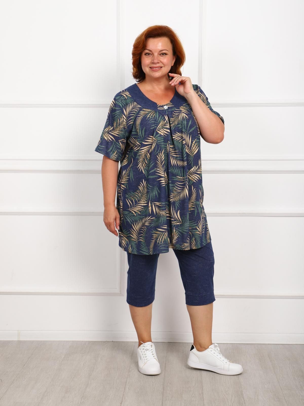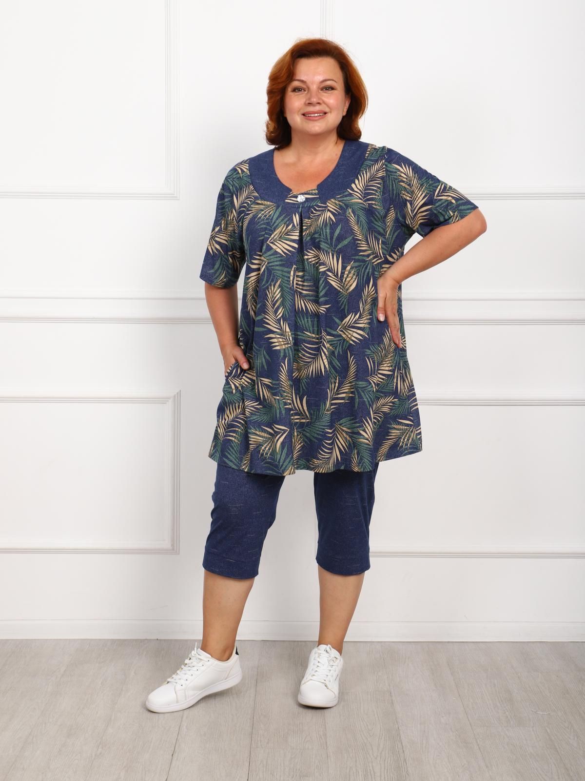 Костюм женский больших размеров состоит из туники и бридж. Туника прямого силуэта  по переду имеются складки, в боковых швах карманы. Бриджи высокой посадки, длиной до середины икры.