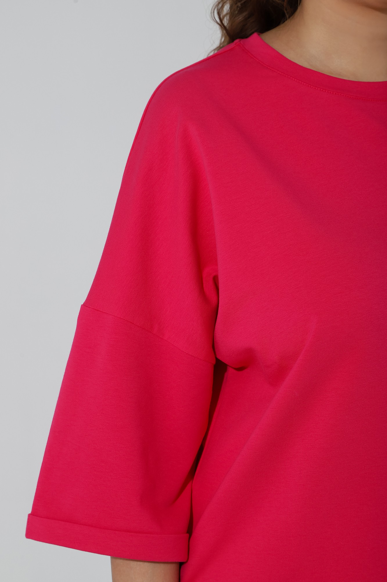 Джемпер – свободного покроя, с рукавами на основе цельнокроеных длиной до локтя, горловиной овальной формы, обработанной втачной планкой, разрезами в боковых швах и принтом на полочке. Рукава – с цельнокроеными манжетами-отворотами. Модный элемент- разность длины полочки и спинки на 10 см.