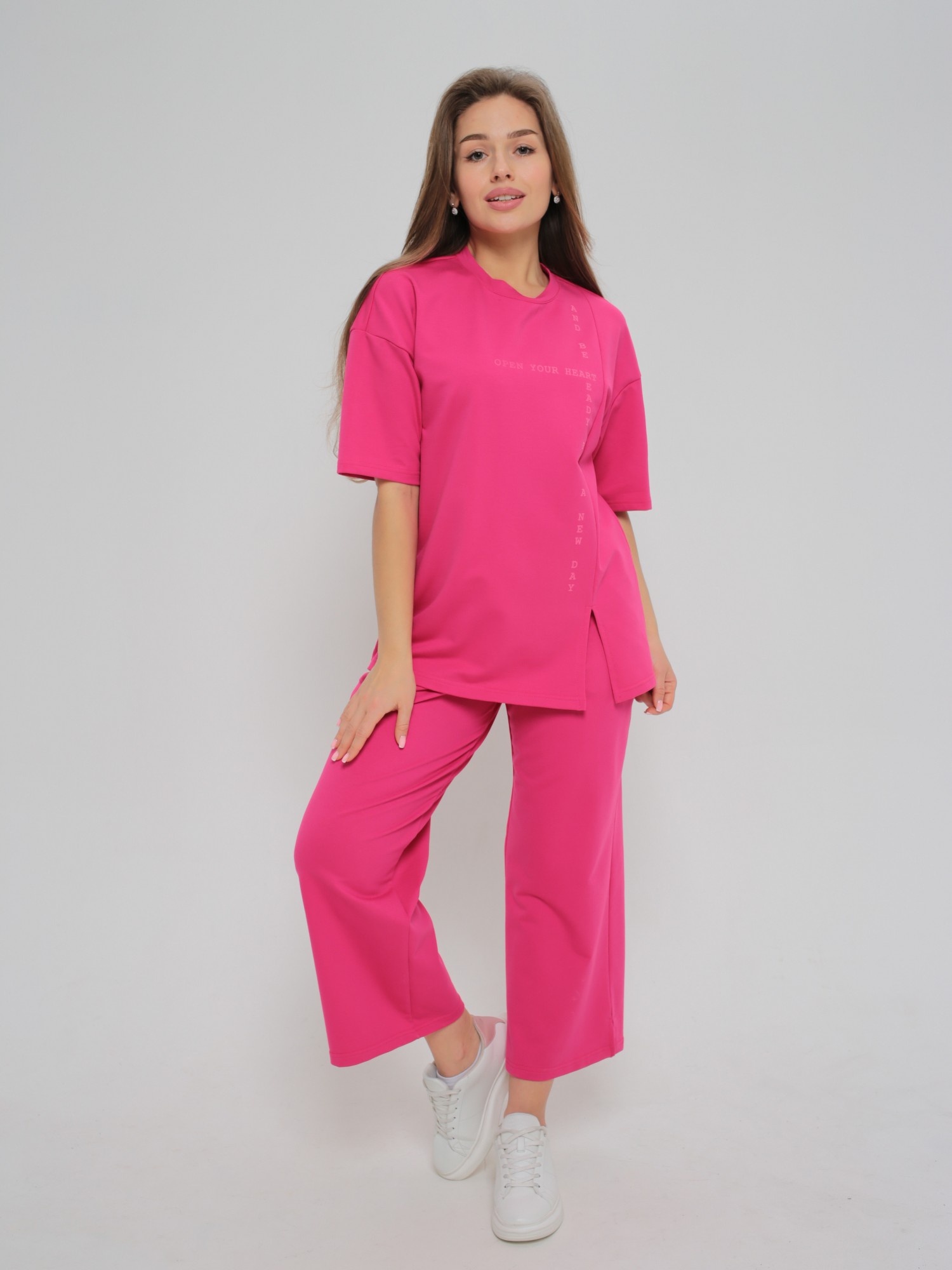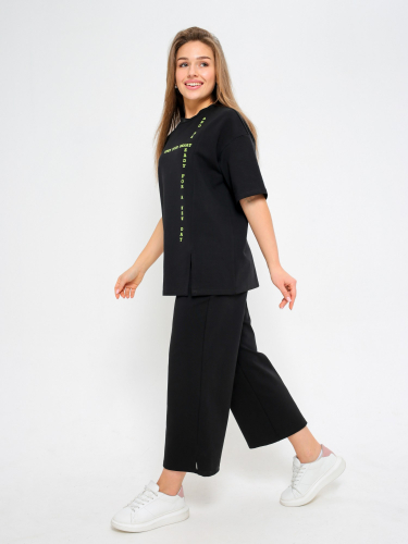 Костюм молодежный из гладкокрашеного трикотажного полотна «футер-двунитка», состоящий из футболки и брюк-кюлотов.