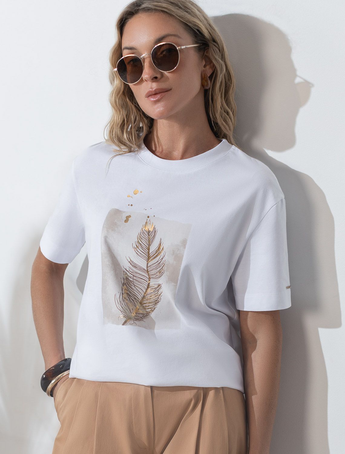 Модная футболка белого цвета привлекает внимание своим интересным дизайном и ярким принтом. Благодаря прямому крою изделие комфортно садится на любую фигуру, в том числе на большие размеры, и не сковывает движений. Круглый вырез подчеркивает современный стиль, а натуральный материал из хлопка с добавлением эластана обеспечивает удобство в повседневной носке и приятные тактильные ощущения. Прочность и износостойкая структура позволяют сохранять свежий внешний вид после множества стирок. Принт в виде пера нанесен красками с устойчивым покрытием.Стильная футболка гармонично вписывается в любой гардероб и подойдет для прогулок, отдыха или неформальных встреч. Благодаря особенностям кроя модель хорошо сидит, скрывая недостатки и подчеркивая достоинства. Яркая футболка идеально сочетается с базовыми вещами, позволяя создавать новые интересные образы каждый день.