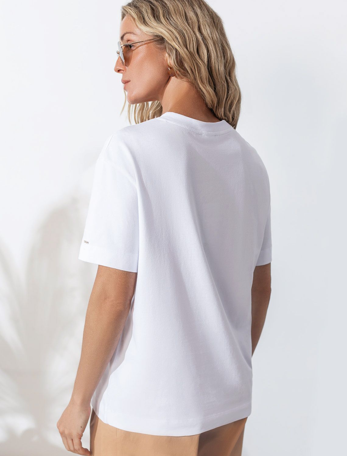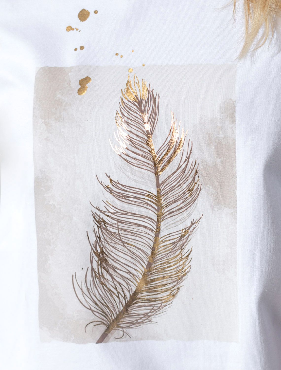 Модная футболка белого цвета привлекает внимание своим интересным дизайном и ярким принтом. Благодаря прямому крою изделие комфортно садится на любую фигуру, в том числе на большие размеры, и не сковывает движений. Круглый вырез подчеркивает современный стиль, а натуральный материал из хлопка с добавлением эластана обеспечивает удобство в повседневной носке и приятные тактильные ощущения. Прочность и износостойкая структура позволяют сохранять свежий внешний вид после множества стирок. Принт в виде пера нанесен красками с устойчивым покрытием.Стильная футболка гармонично вписывается в любой гардероб и подойдет для прогулок, отдыха или неформальных встреч. Благодаря особенностям кроя модель хорошо сидит, скрывая недостатки и подчеркивая достоинства. Яркая футболка идеально сочетается с базовыми вещами, позволяя создавать новые интересные образы каждый день.