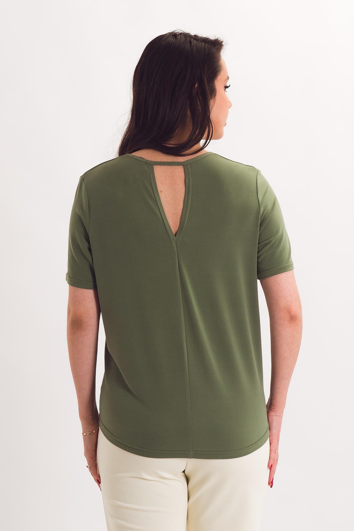 Описание: Футболка приобретает совершенно новое прочтение за счет сборки центра переда на резинку и треугольного выреза по спинке.