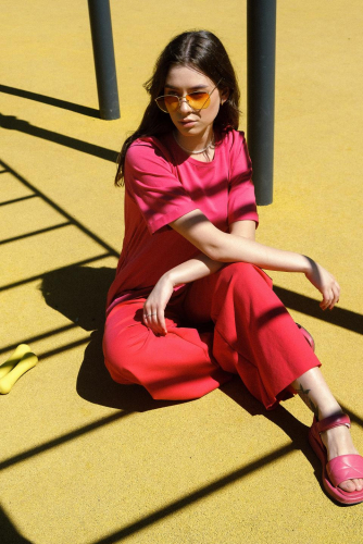 Описание: Молодежная футболка прямого силуэта, с удобными, слегка расширенными к низу рукавами и широкой подгибкой, поможет вам создать интересный и модный образ, в котором вы будете чувствовать себя комфортно.