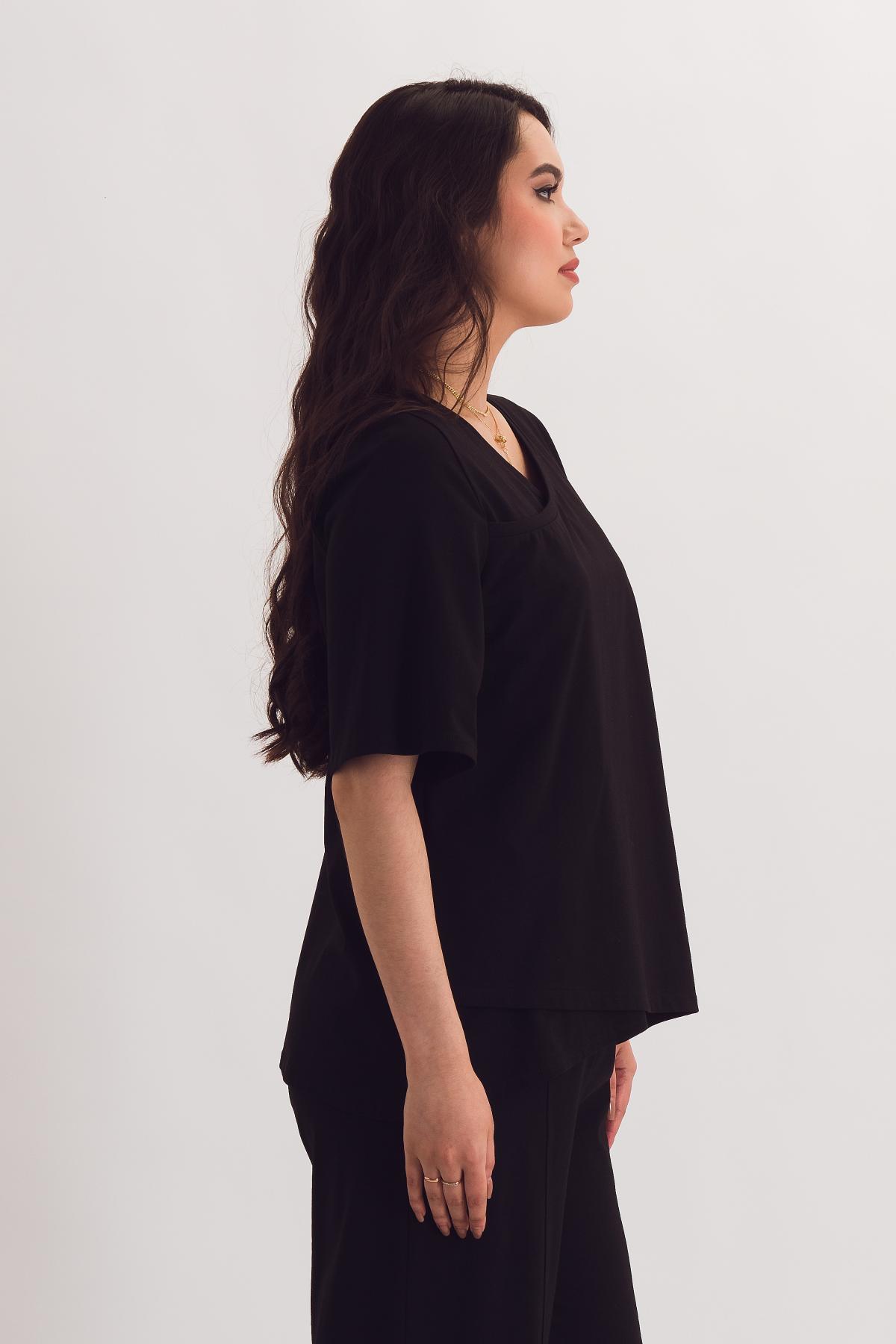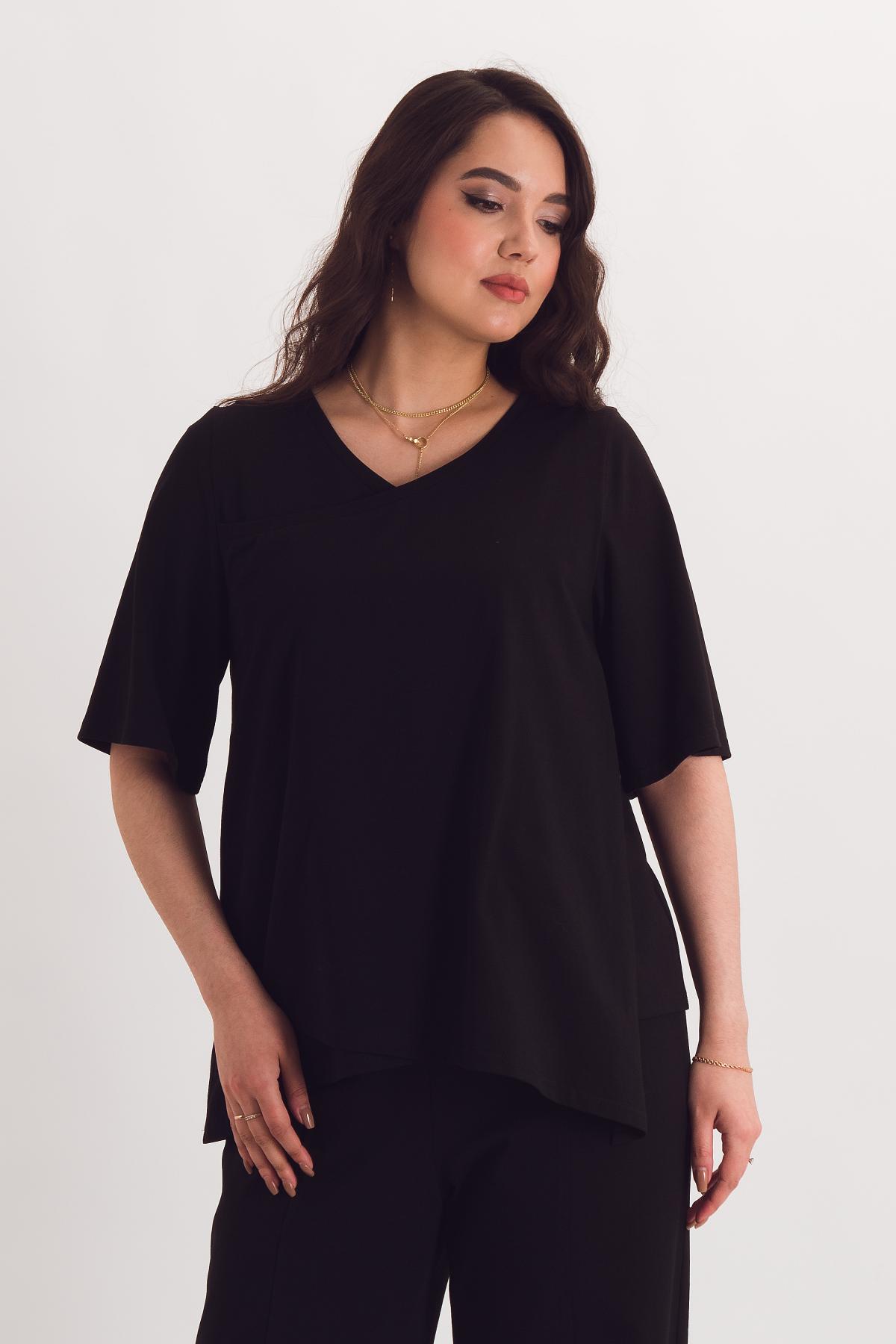 Описание: Необычная футболка с декоративным запахом по переду имеет небольшое расклешение к низу.