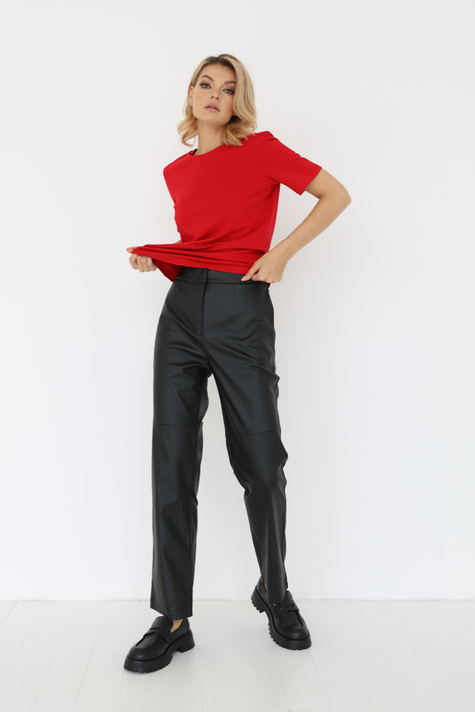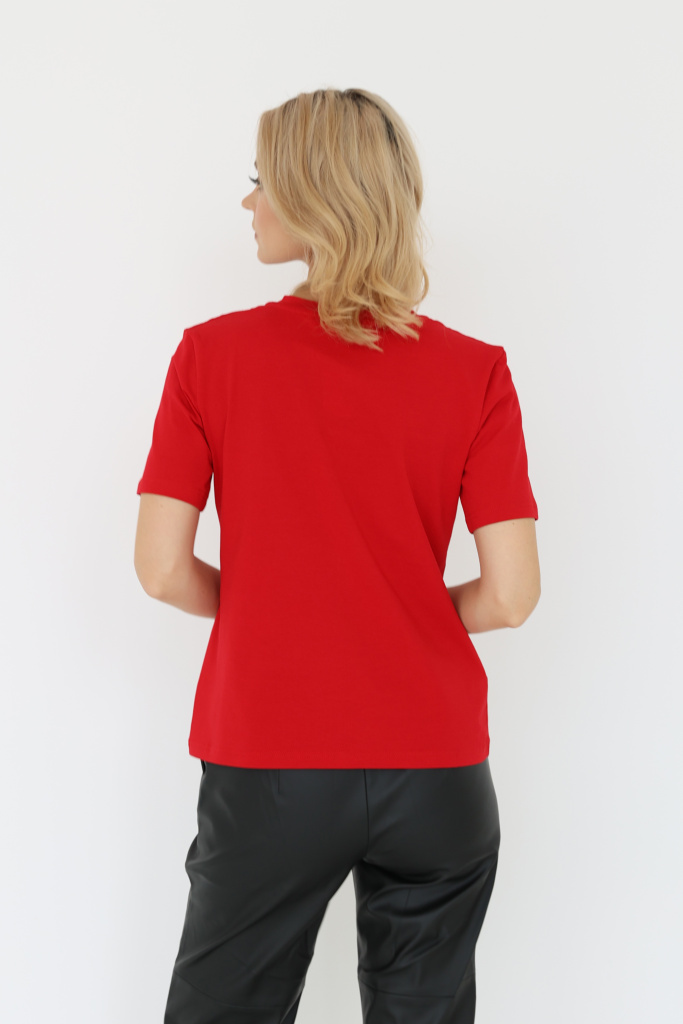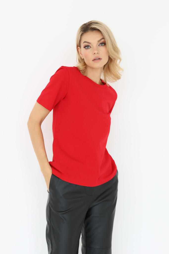 Футболка прямого силуэта с круглой горловиной и втачным рукавом. Выполнена из легкого приятного к телу трикотажа на основе хлопка с добавлением лайкры.
