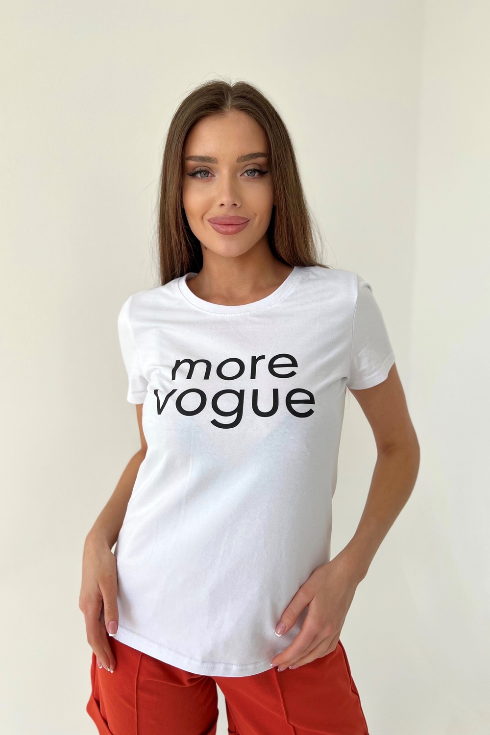 Футболка прямого силуэта, с округлой горловиной, длиной до середины бедра. Рукав втачной, короткий. Горловина обработана обтачкой из основного полотна.