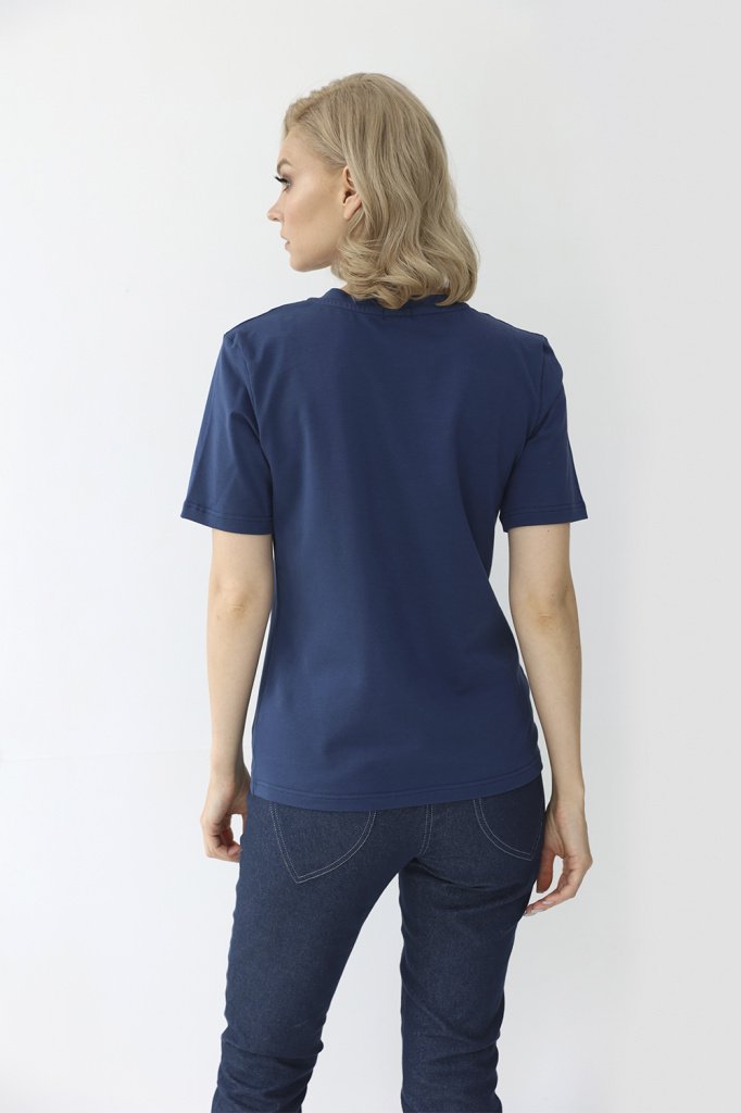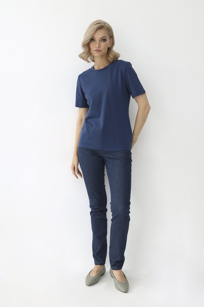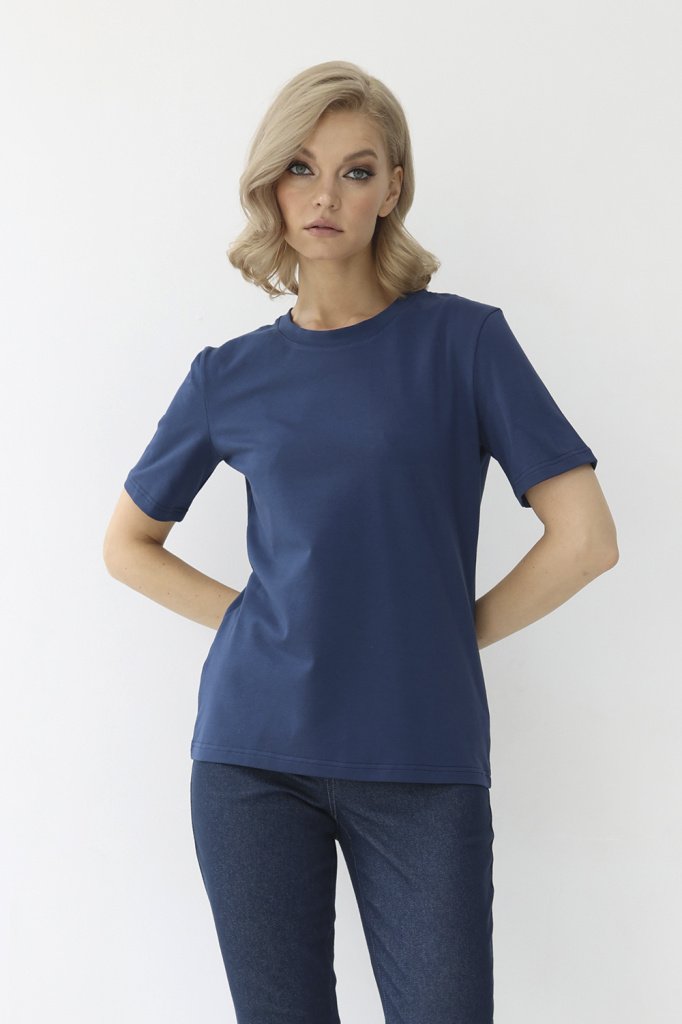 Футболка прямого силуэта с круглой горловиной и втачным рукавом. Выполнена из легкого приятного к телу трикотажа на основе хлопка с добавлением лайкры.