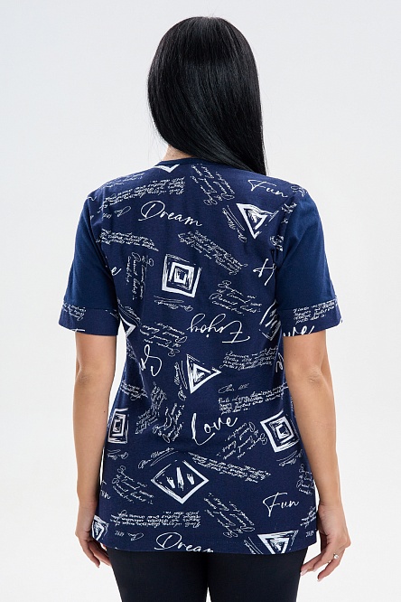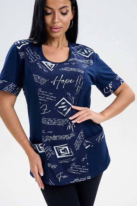 Удобная трикотажная футболка с карманами и декоративными вставками с набивным рисунком.
