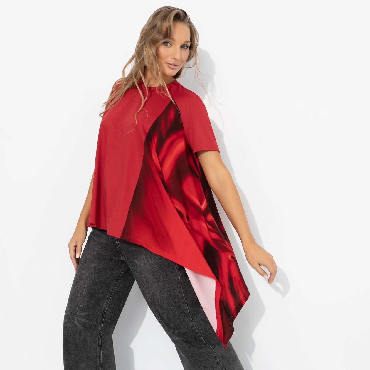Когда другие делают ставку на классику – вы делаете ход конём. Блуза «Я здесь главная» – красный, асимметрия и энергия победы. Асимметричная футболка свободного кроя из мягкого трикотажа с лёгкой драпировкой сбоку. Контрастная вставка с арт-принтом создаёт динамику и стройнит силуэт. Не мнётся. Подойдёт самым смелым.