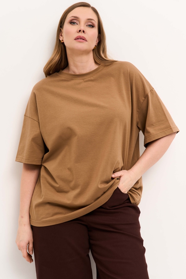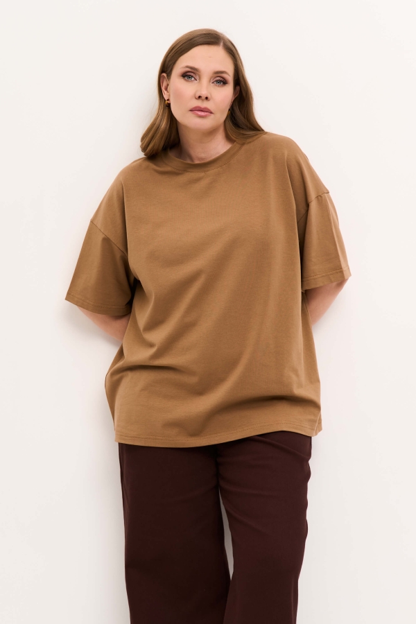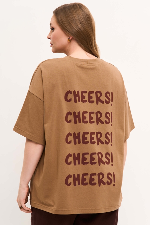 Свободная футболка с принтом по спинке. Спущенное плечо, круглая горловина, длина рукава до сгиба локтя.