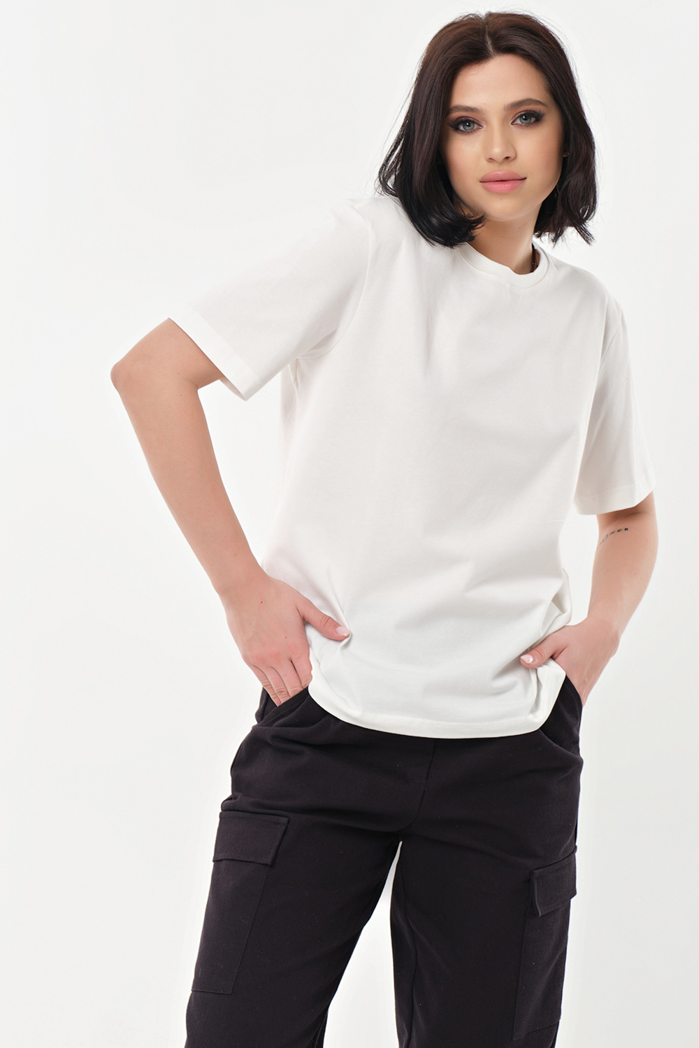 Футболка прямого силуэта из трикотажа. Детали: горловина обработана бейкой, низ рукава обработан в подгибку с отстрочкой. По переду нанесен принт.