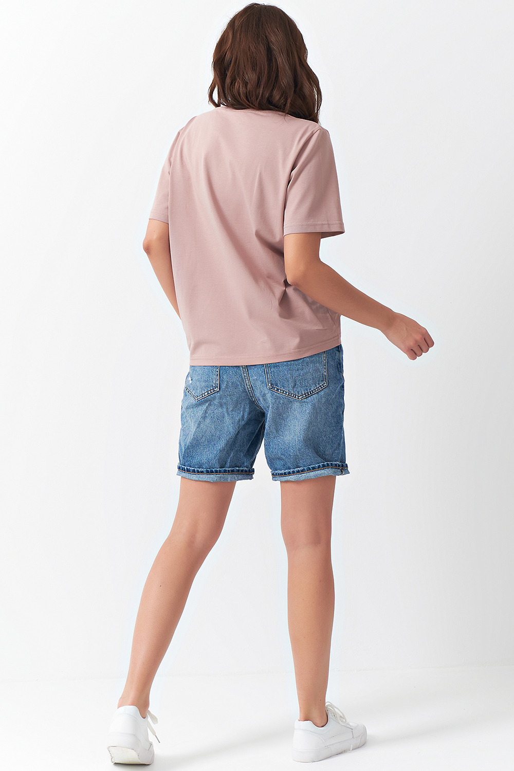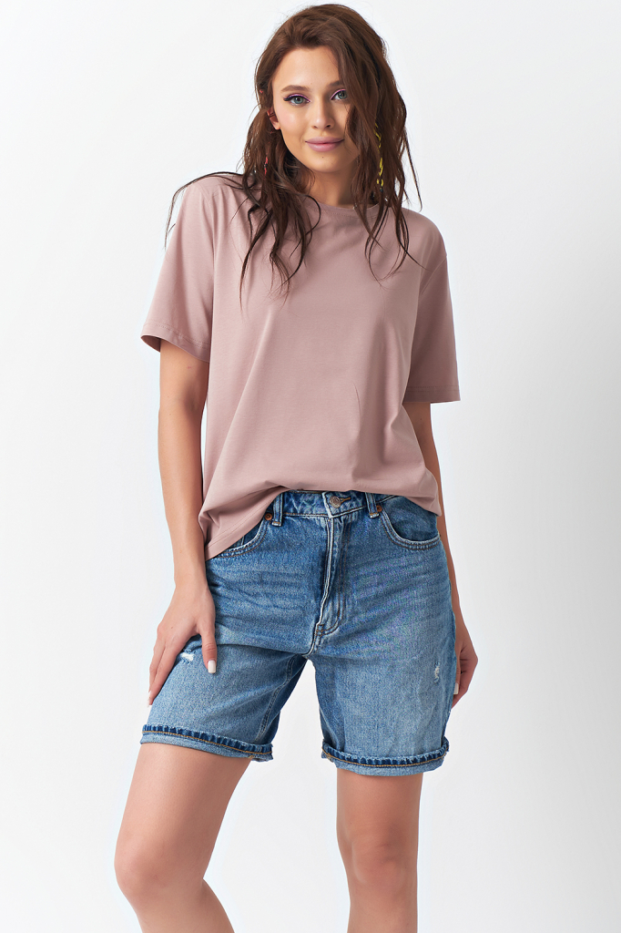 Футболка прямого силуэта из трикотажа. Детали: горловина обработана бейкой, низ рукава обработан в подгибку с отстрочкой.