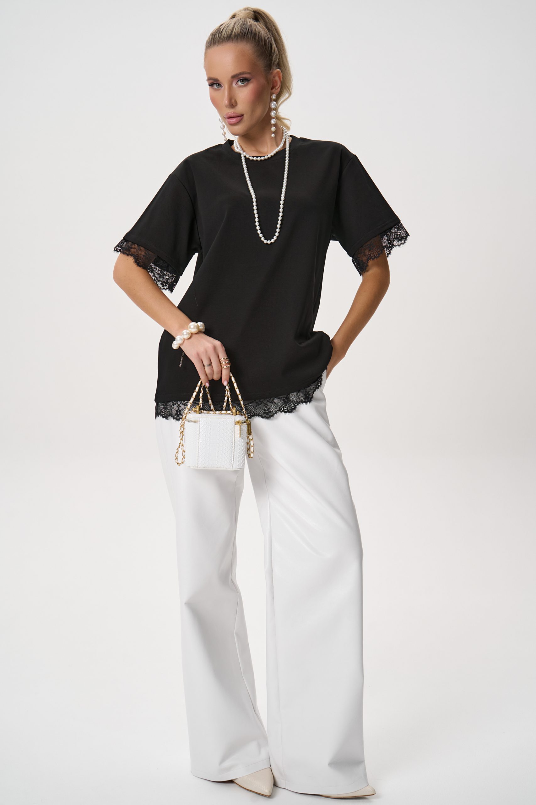 Футболка с кружевной отделкой — женственная базовая модель, которая легко вписывается как в повседневные, так и в более элегантные образы. Лаконичный крой в сочетании с деликатным кружевом делает изделие универсальным: футболка гармонично смотрится с джинсами, брюками и юбками, добавляя образу мягкости и утонченности.