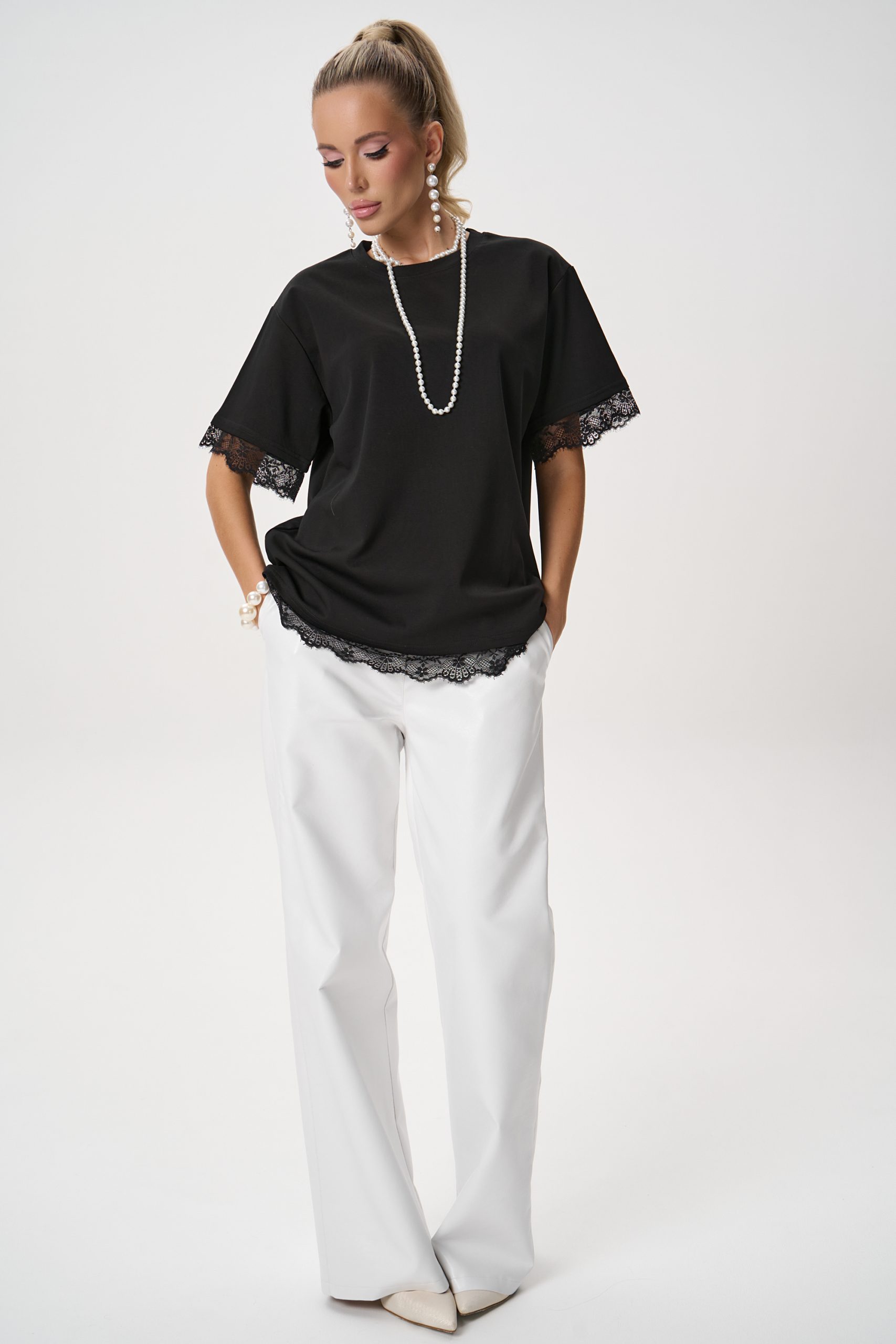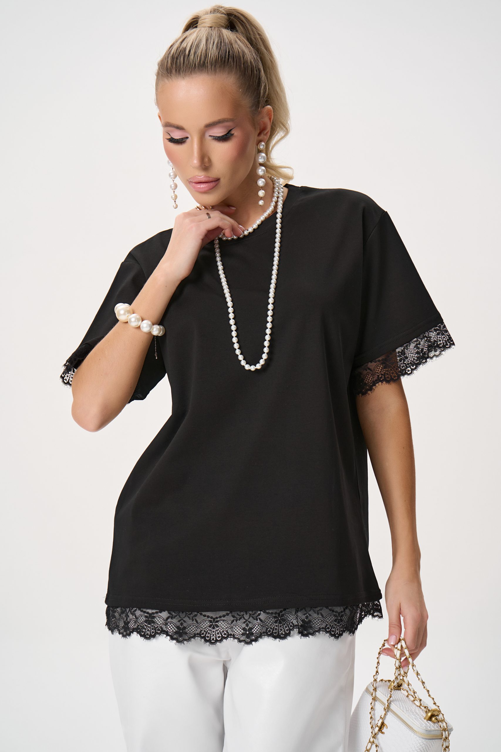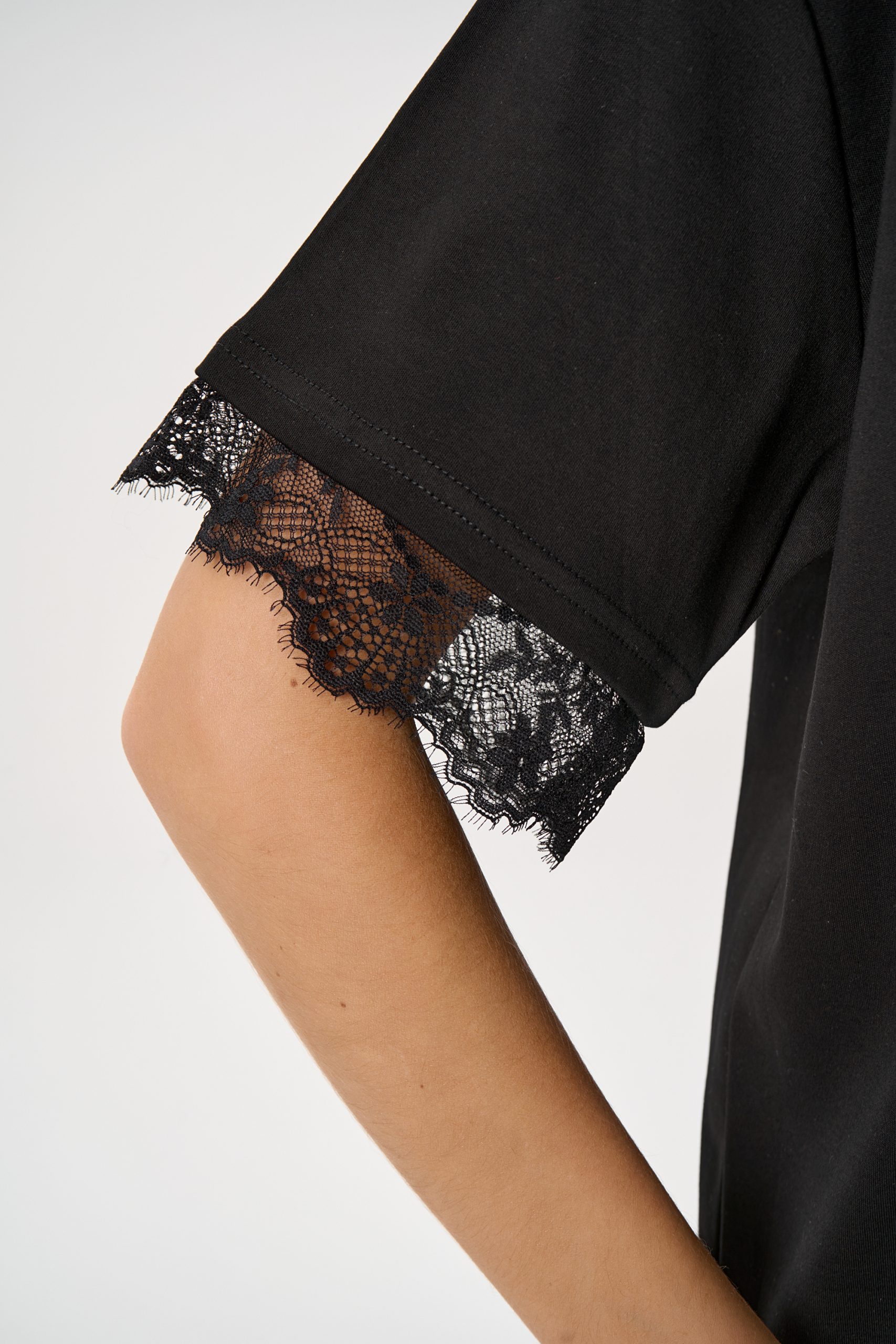 Кружевная отделка придаёт модели лёгкий акцент и делает базовую футболку более выразительной.