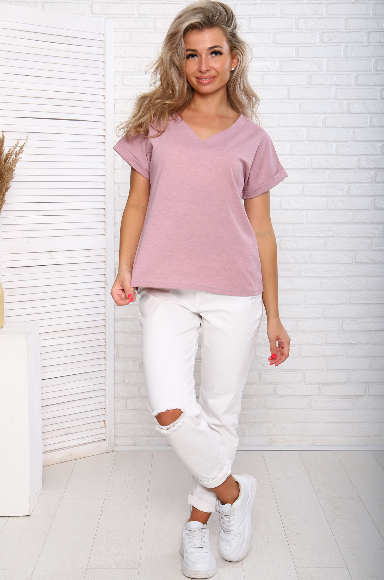 Красивая и нежная модель однотонной хлопковой футболки. Незаменимая вещь в гардеробе, подходит к шортам, джинсам, брюкам или юбкам. Модель свободная, не стесняет движений, приталенного силуэта, с цельнокроенным рукавом на манжетах, глубокий, стильный и очень изящный вырез "галочкой" подчеркнёт зону декольте и сделает образ привлекательным и женственным.