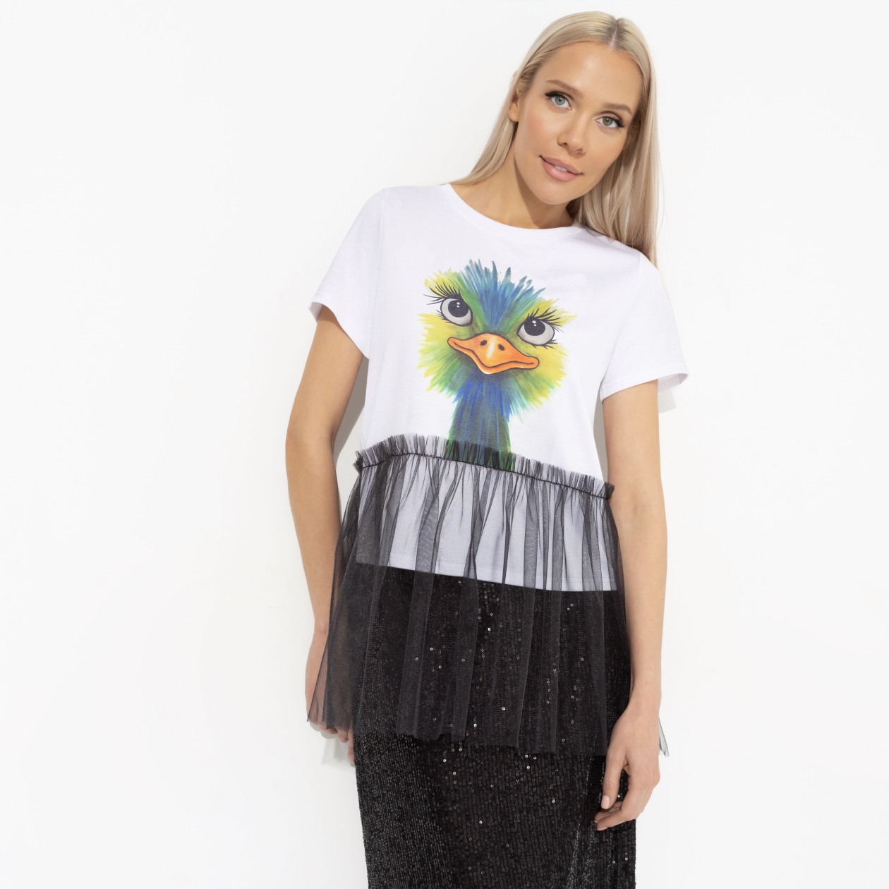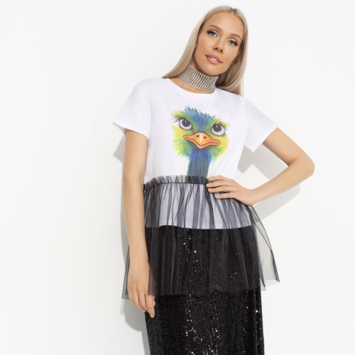 Микс, поражающий в самое сердце. Ты красивая и умная, добрая и справедливая, обожаешь вышивать крестиком и кататься на сноуборде, носишь футболку с птичкой и дерзкой прозрачной баской. С тобой не соскучишься. Футболка классического кроя с принтом. Изделие дополнено прошитой баской из прозрачной сетки. Длина баски ниже линии бедра.