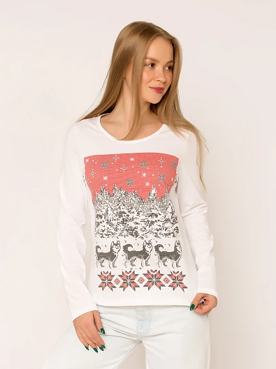 Оригинальная женская футболка с длинным рукавом и красивым изображением на полочке. Футболка выполненя 100% хлопкового полотна приятного на ощупь. Данная модель слегка расклешеного кроя, круглая горловина обрабатывается под окантовку. Такая футболка отлично подойдёт на каждый день.
