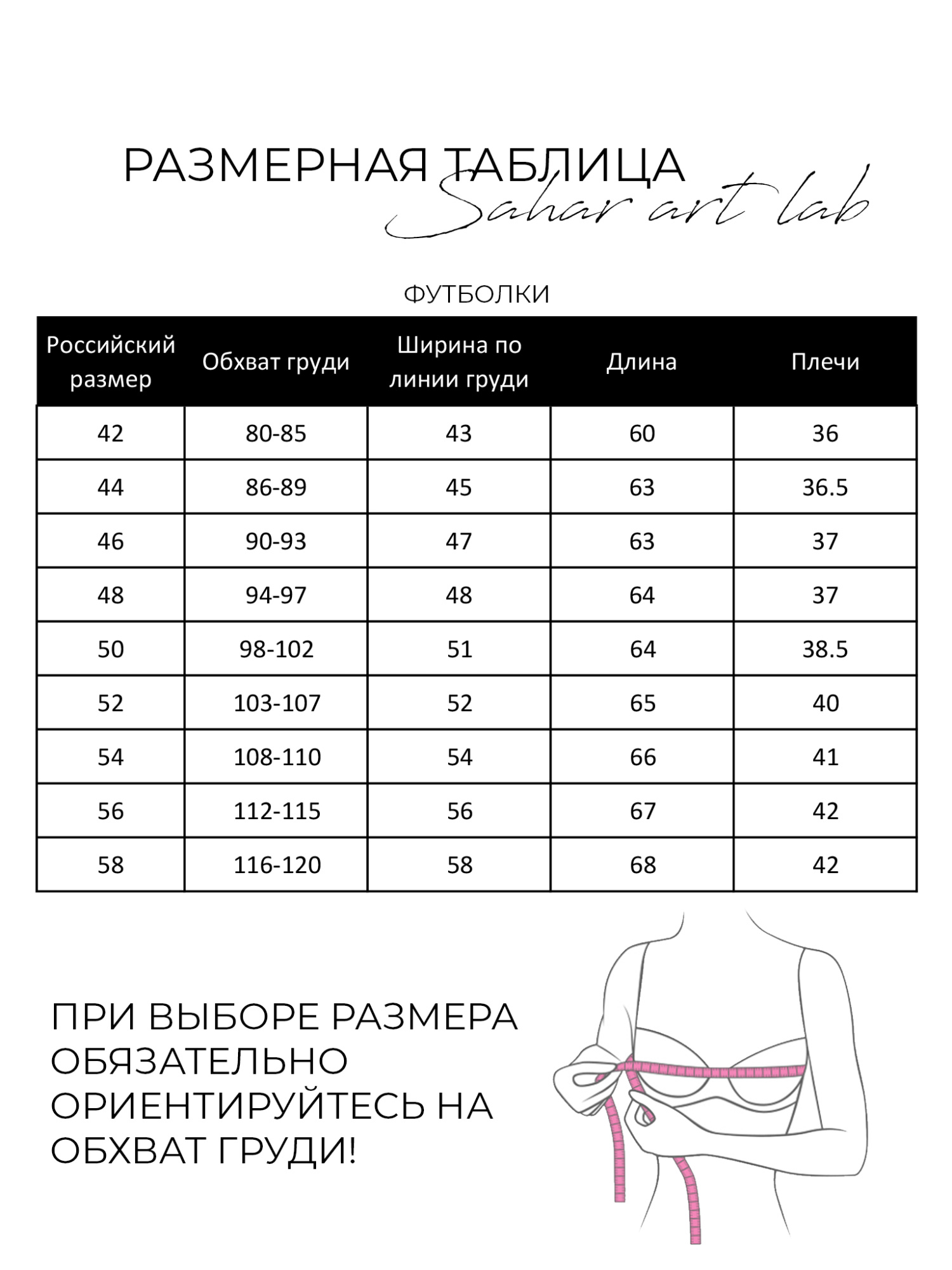 Выбирая футболку ориентируйтесь на таблицу размеров. Для свободной посадки возьмите на 1-2 размера больше. На модели на фото майка женская с печатью размера М (46). Девушка размера 42-44.