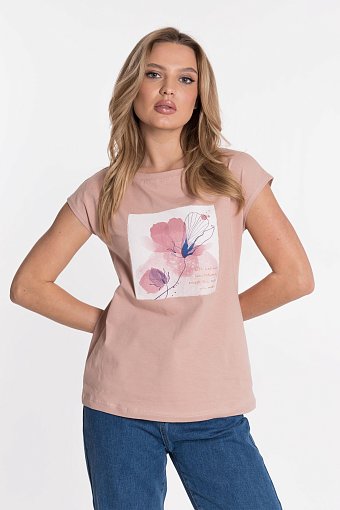 Женская футболка — отличный выбор для повседневного гардероба. Она изготовлена из мягкой и эластичной ткани — однотонной кулирки с добавлением лайкры, что обеспечивает комфорт при носке и свободу движений. Горловина футболки имеет форму «лодочки», линия плеча слегка спущена, а короткий рукав добавляет изделию лёгкость. Однотонный дизайн футболки дополнен принтом спереди, что придаёт ей стильный вид.
