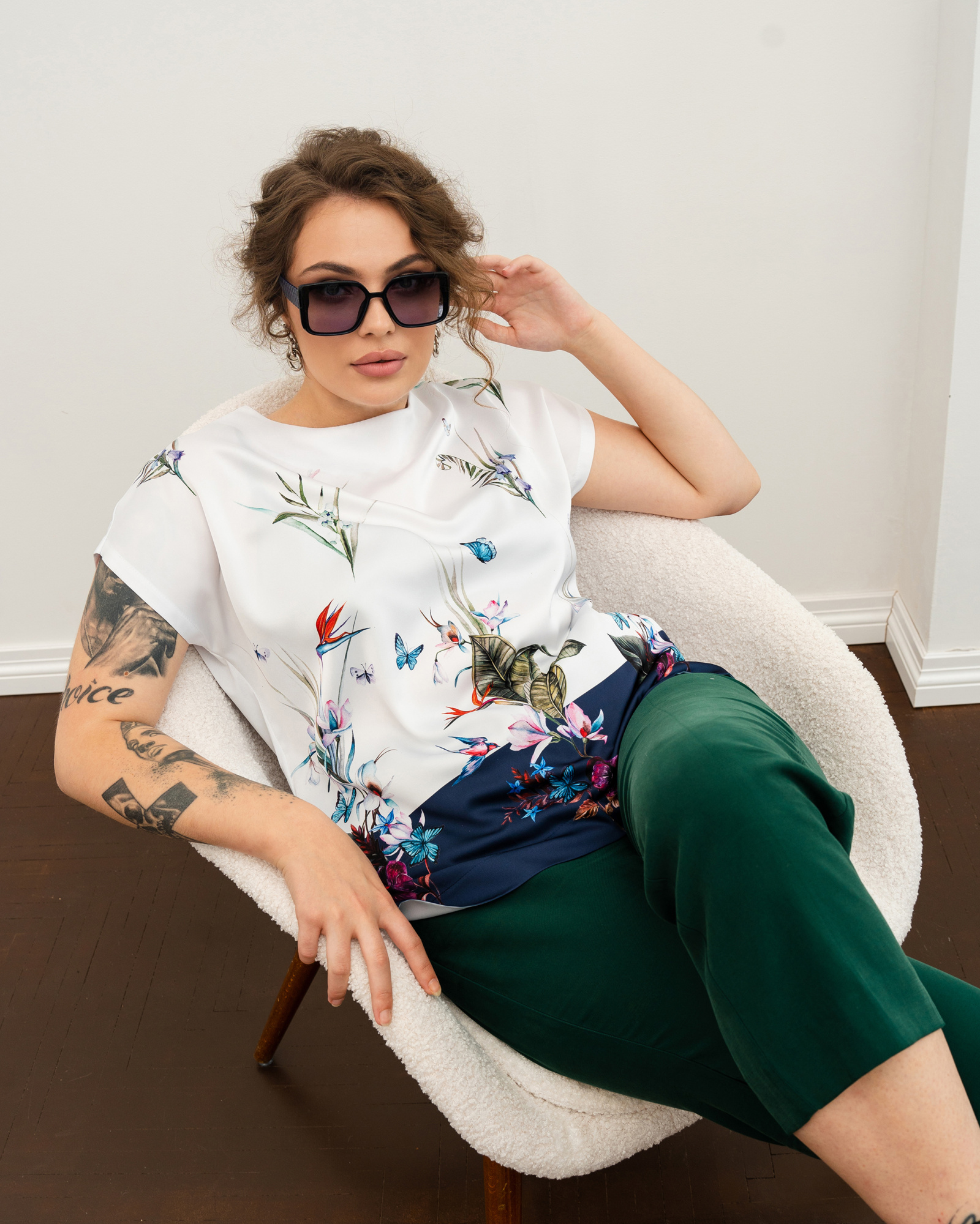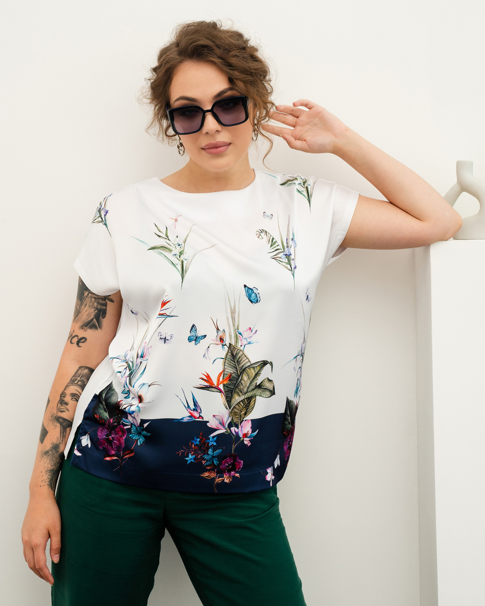 Спереди под принт используется шёлк «Армани». Это ткань, которая по внешнему виду похожа на натуральный шёлк. Но Армани намного проще в уходе, более упругая и плотная по структуре, а также хорошо удерживает краски рисунка в волокнах. Поэтому наши принты износостойкие, не крошатся, не линяют и остаются яркими на протяжении нескольких сезонов.
