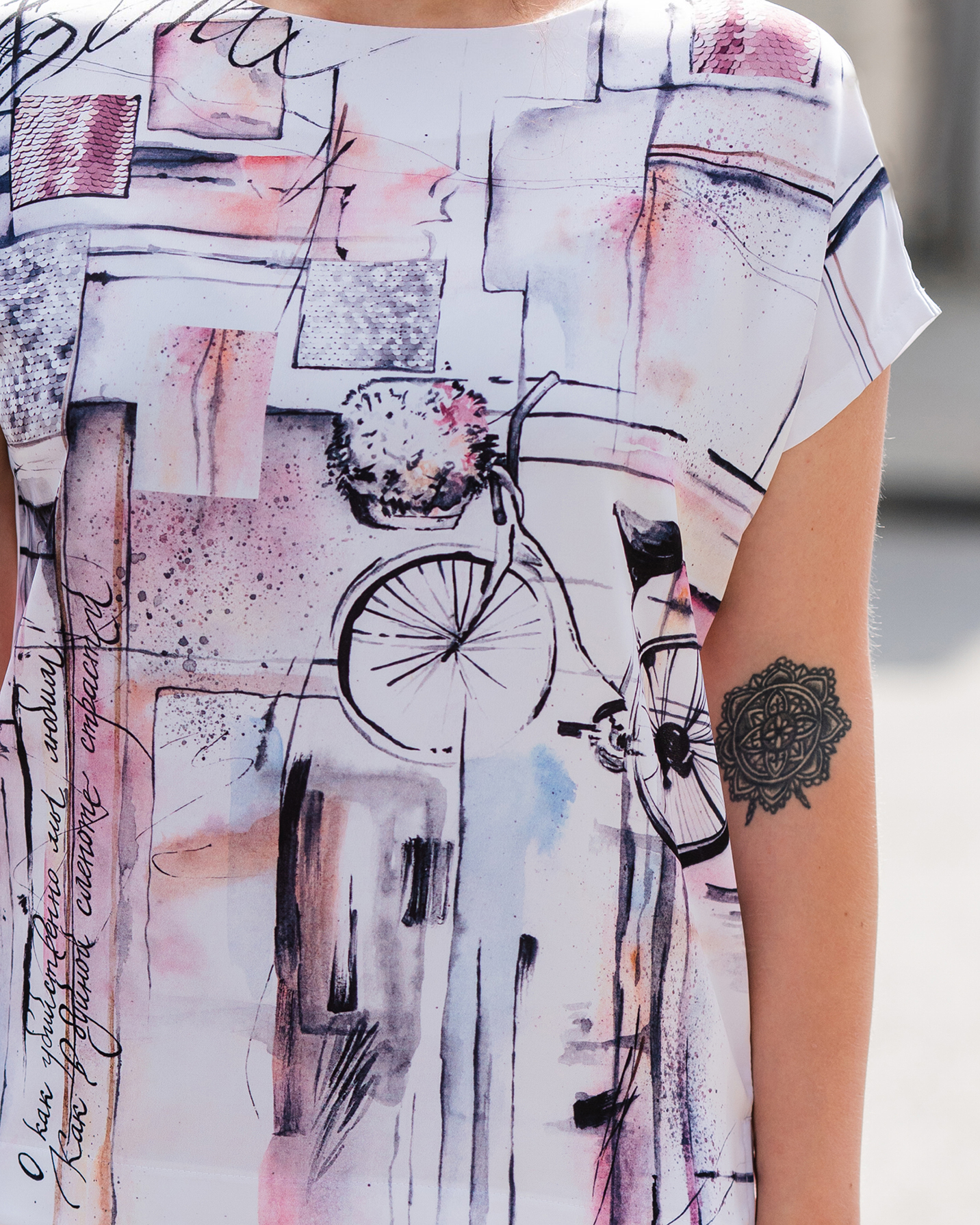 Спереди под принт используется шёлк «Армани». Это ткань, которая по внешнему виду похожа на натуральный шёлк. Но Армани намного проще в уходе, более упругая и плотная по структуре, а также хорошо удерживает краски рисунка в волокнах. Поэтому наши принты износостойкие, не крошатся, не линяют и остаются яркими на протяжении нескольких сезонов.