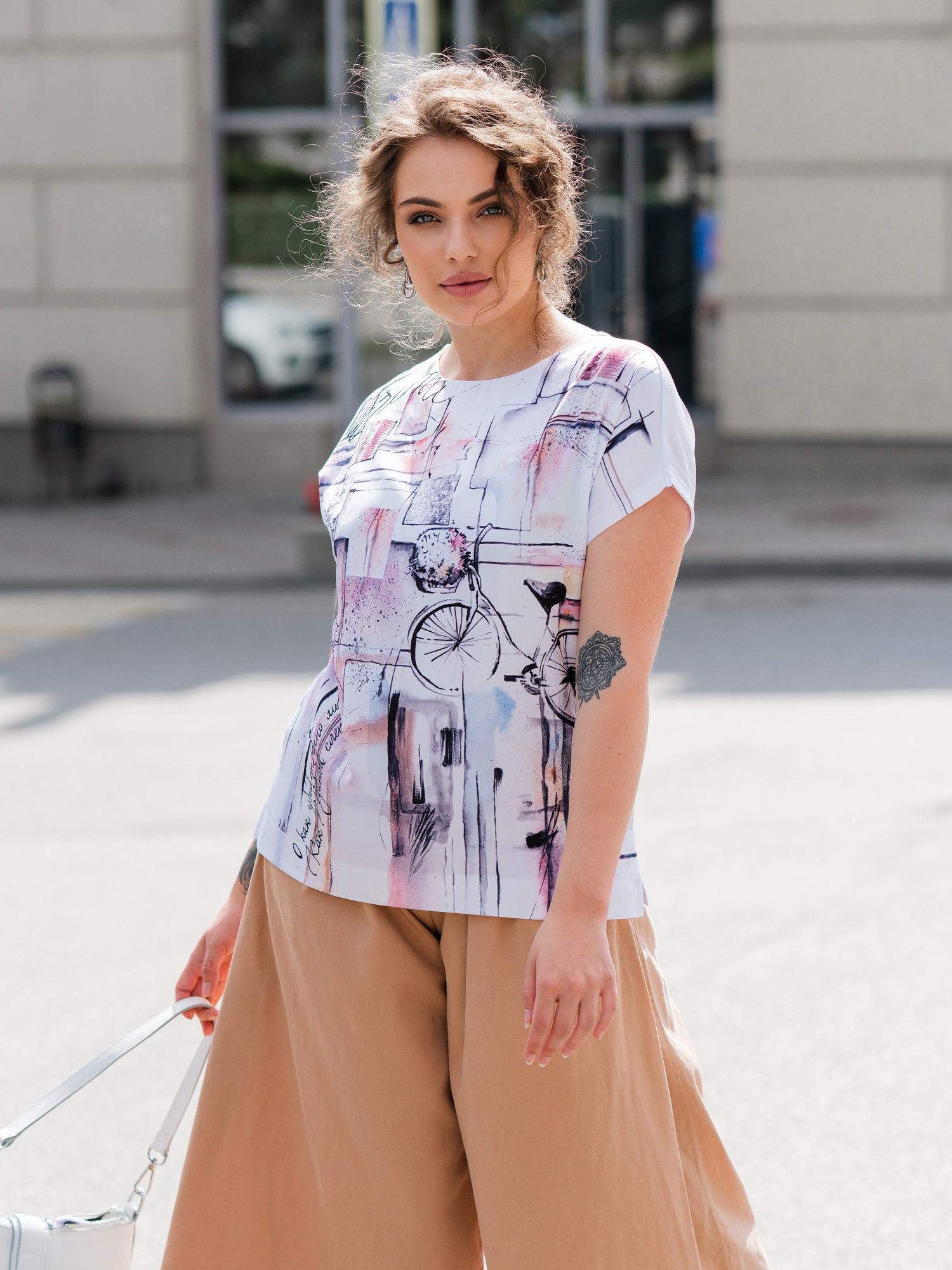 Спинка футболки для женщин сделана из трикотажа «Венеция». Это тонкий плотный трикотаж с матовой поверхностью, мягкий и шелковистый на ощупь, не образует катышков.  Футболка с принтом максимально соответствует требованиям качества благодаря сочетанию этих двух материалов.