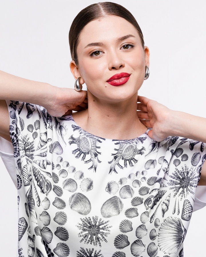 Спереди под принт используется шёлк «Армани». Это ткань, которая по внешнему виду похожа на натуральный шёлк. Но Армани намного проще в уходе, более упругая и плотная по структуре, а также хорошо удерживает краски рисунка в волокнах. Поэтому наши принты износостойкие, не крошатся, не линяют и остаются яркими на протяжении нескольких сезонов.