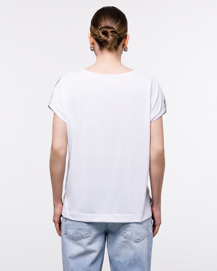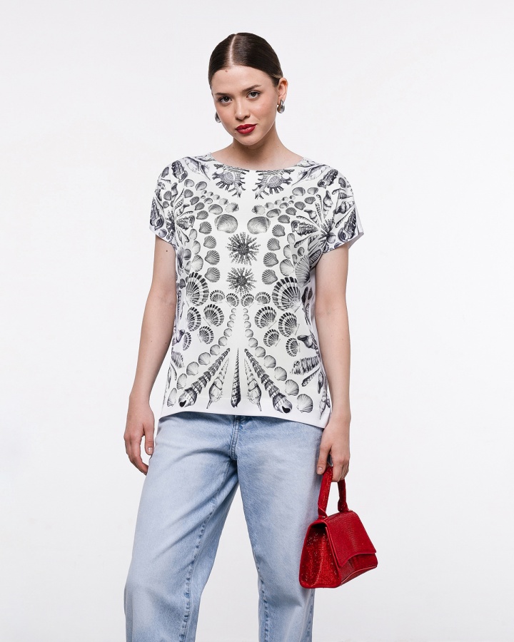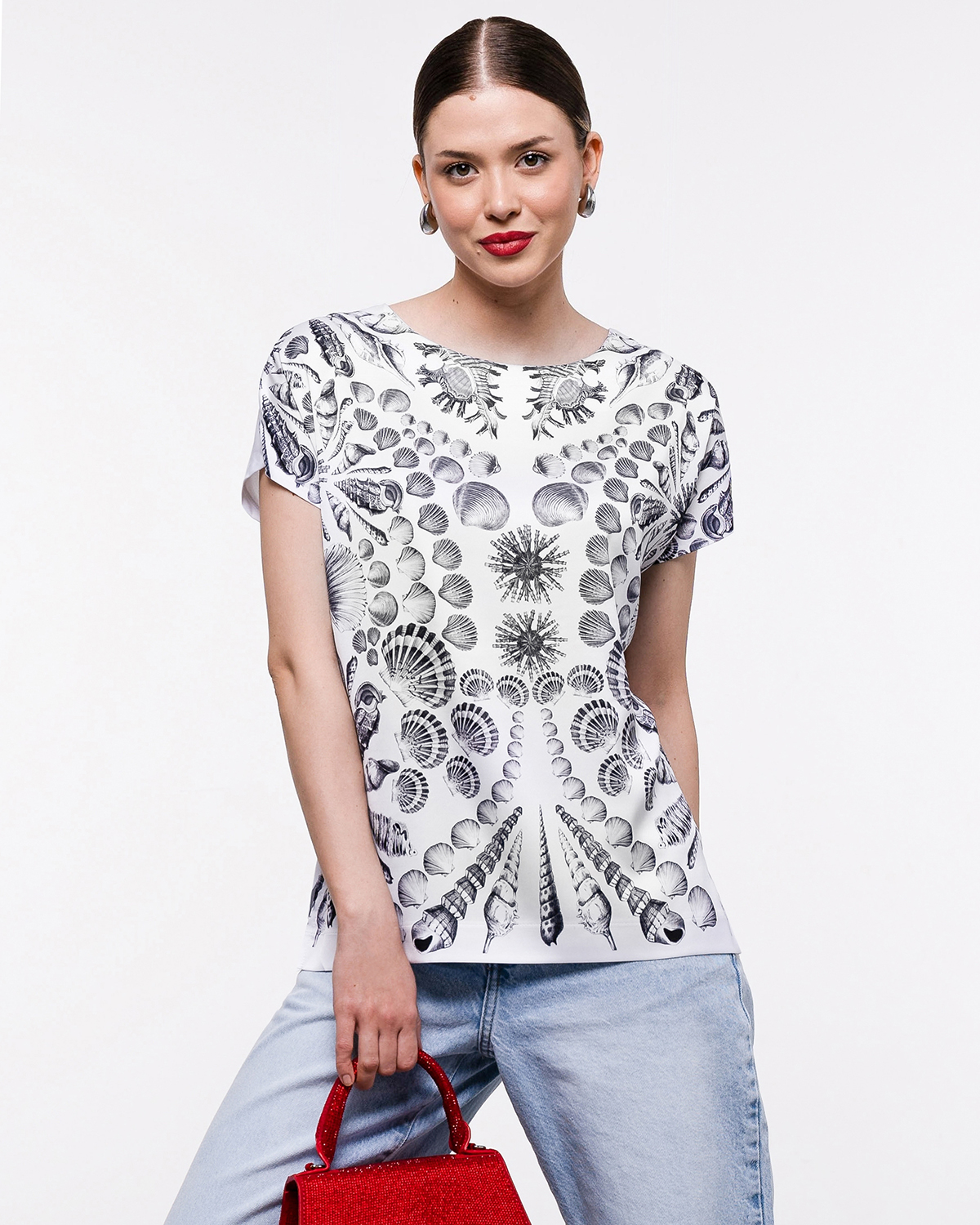 Спинка футболки для женщин сделана из трикотажа «Калифорния». Эта ткань очень комфортна для тела, хорошо дышит и дарит ощущение прохлады летом. Футболка с принтом максимально соответствует требованиям качества благодаря сочетанию этих двух материалов.