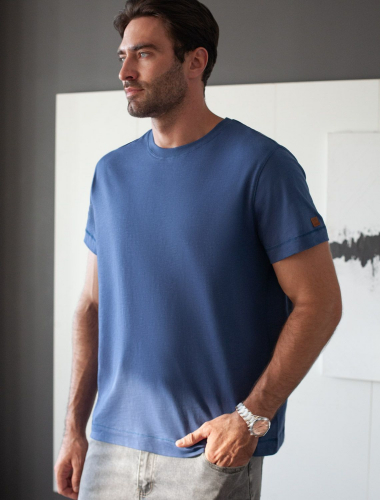 Футболка выполнена из фактурного полотна из 100% хлопка. Базовая однотонная модель, без труда впишется в любой гардероб. Ткань имеет характерный рисунок черточки за счет сочетания разных волокон хлопка 140-150 г. Хорошо держит форму и поддерживает комфортный микроклимат в течении дня. На рукаве нашивка из эко-кожи с логотипом бренда.