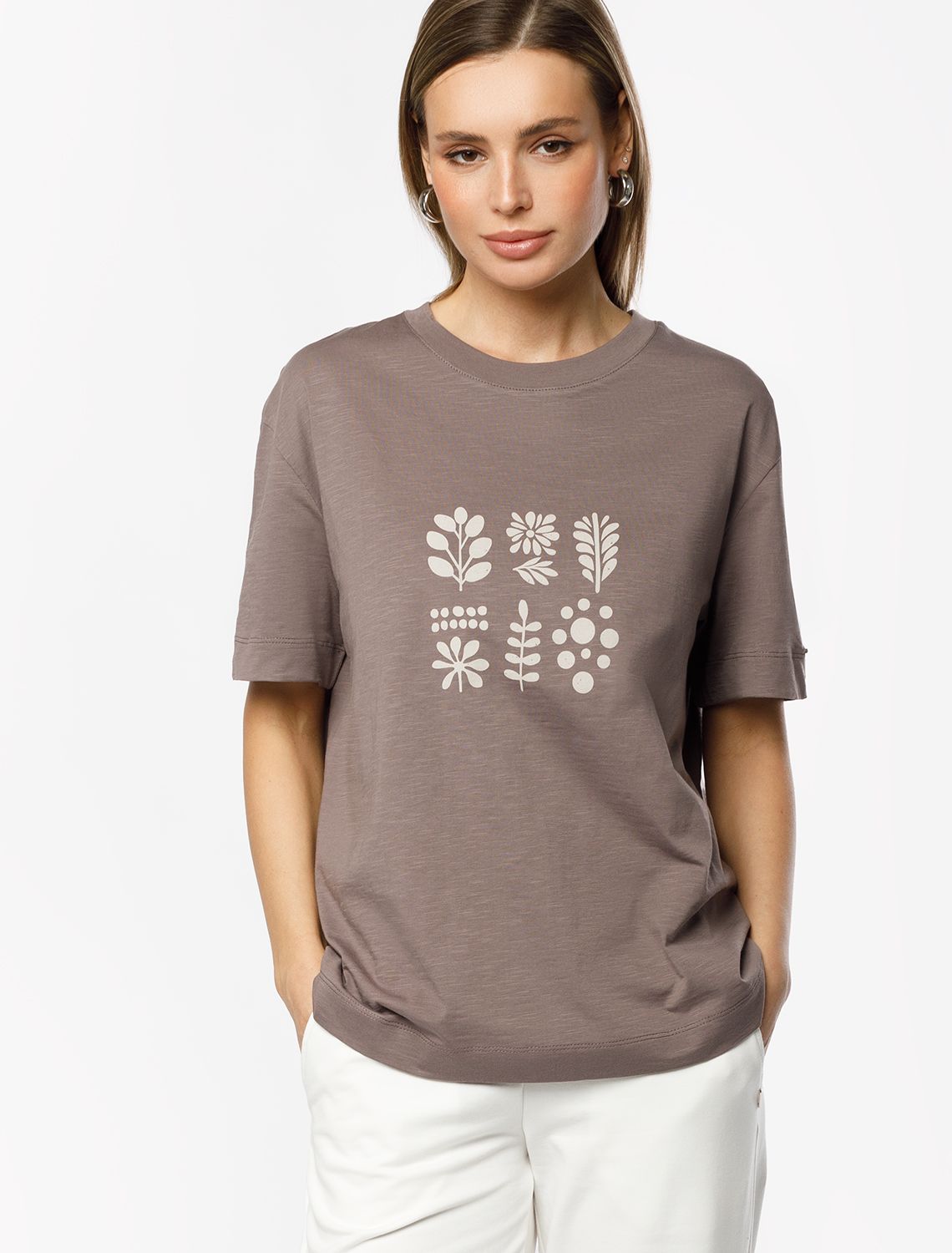 Футболка выполнена из фактурного полотна из 100% хлопка. Модель с лаконичным авторским принтом легко впишется в любой весенне-летний гардероб. Ткань имеет характерный рисунок черточки за счет сочетания разных волокон хлопка 140-150 г. Хорошо держит форму и поддерживает комфортный микроклимат в течении дня.