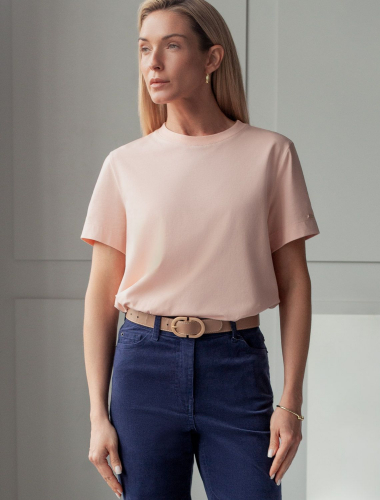 Базовая однотонная футболка из премиального хлопка. Горловина выполнена из рибаны в тон изделия, Добавление эластана в состав изделия способствует формоустойчивости. Самое высокое качество хлопковых волокон обеспечивает комфорт в любое время года. Идеально держит форму и сохраняет внешний вид в течение долговременного использования. Универсальная базовая вещь для ваших стилистических решений. Изделие дополнено металлическим логотипом бренда на рукаве.
