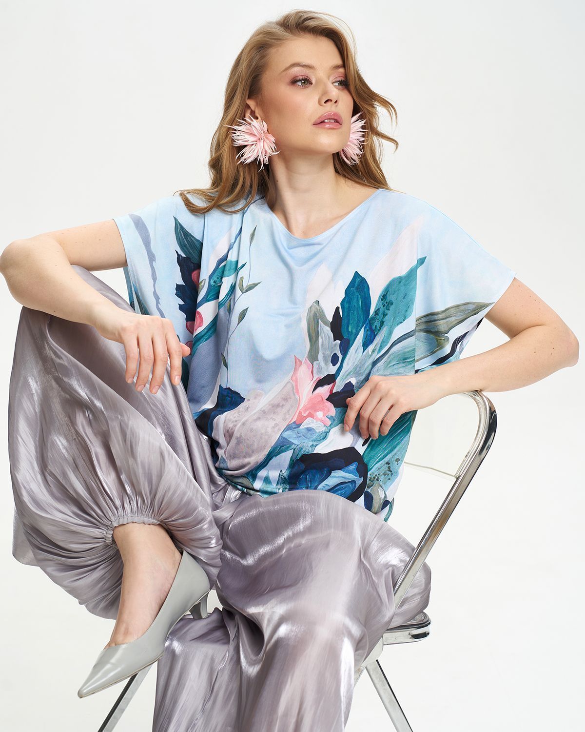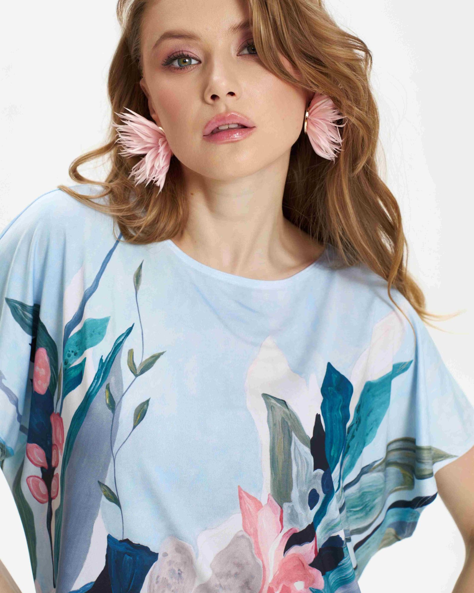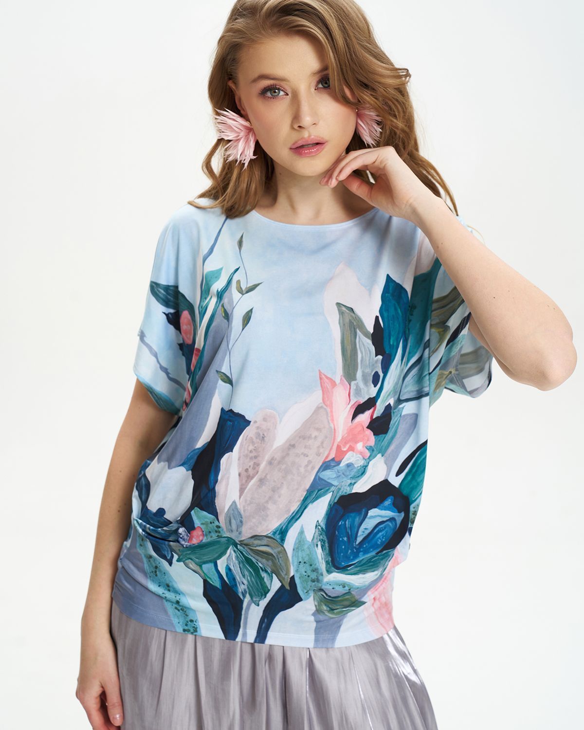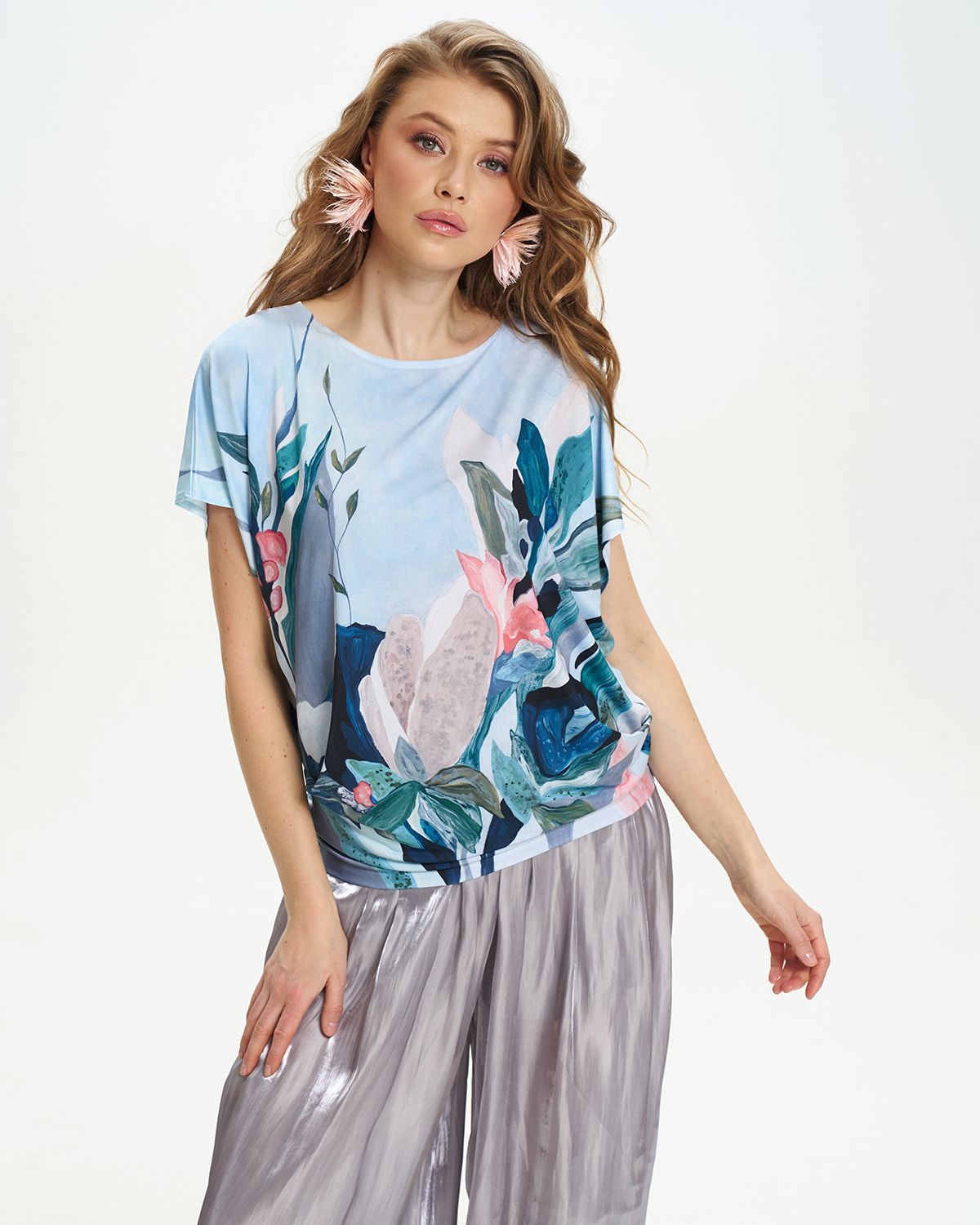 Футболка "Кимоно-баллон" из вискозной ткани "Венеция" с полной запечаткой авторским принтом. Это тонкий плотный трикотаж с матовой поверхностью, мягкий и шелковистый на ощупь, не образует катышков.  Защипы чуть ниже талии позволяют скрыть проблемные зоны фигуры. Принт наносится таким образом, что краска введена в саму текстуру ткани и надежно там закреплена. Трикотаж остается эластичным, нет никаких слоев нанесения сверху ткани. Благодаря такой технологии рисунок остается ярким даже после многочисленных стирок. 70% вискоза, 25% полиэстер, 5% лайкра