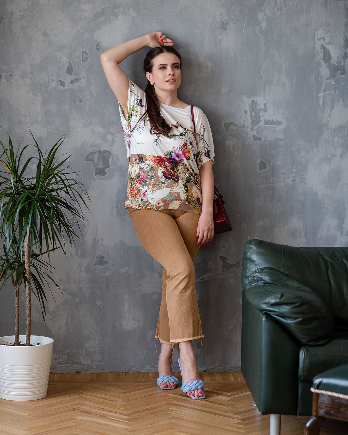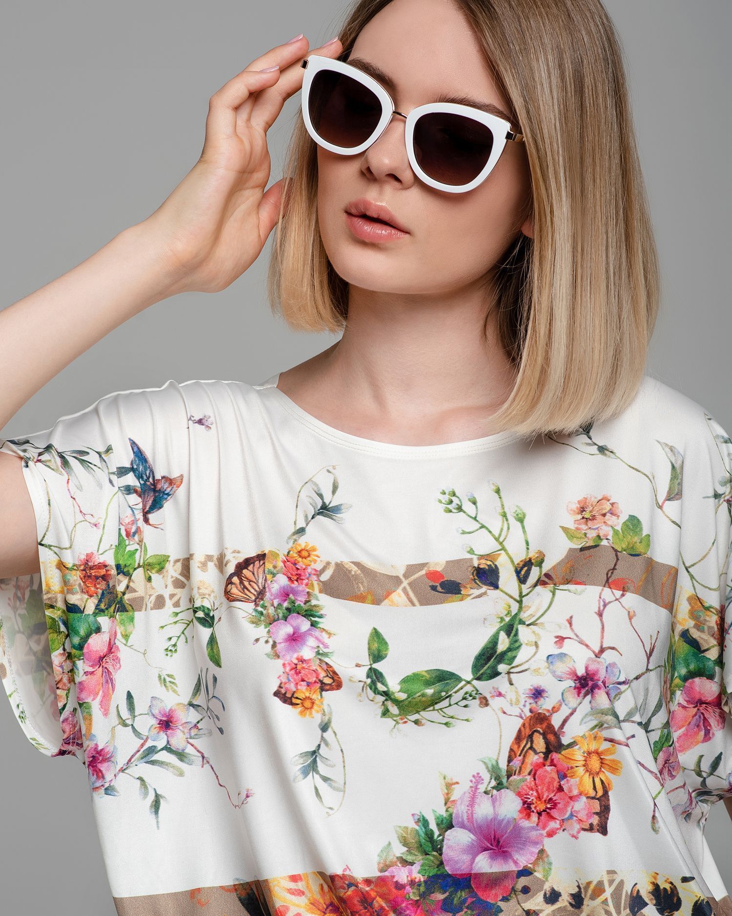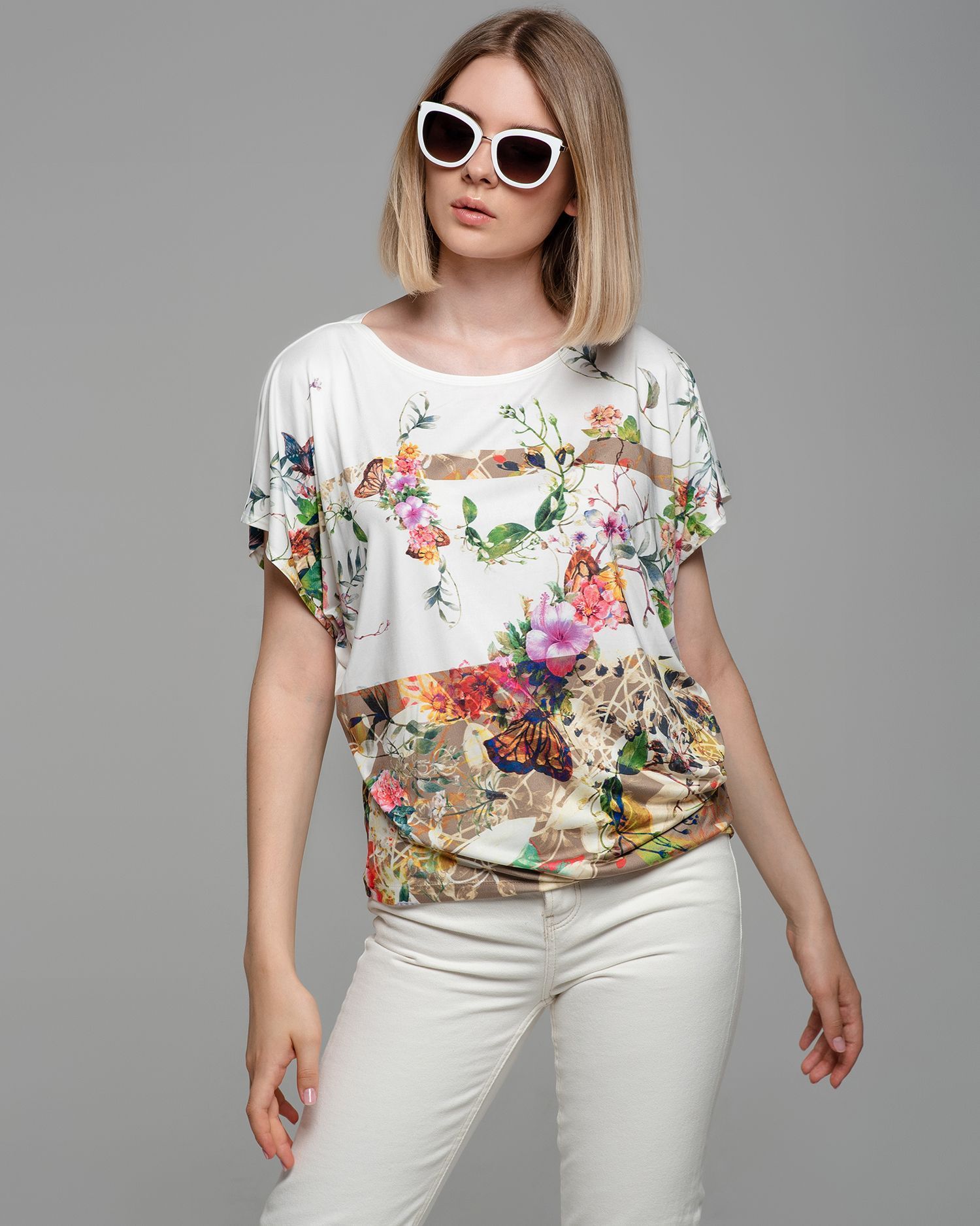 Футболка "Кимоно-баллон" из вискозной ткани "Венеция" с полной запечаткой авторским принтом. Это тонкий плотный трикотаж с матовой поверхностью, мягкий и шелковистый на ощупь, не образует катышков.  Защипы чуть ниже талии позволяют скрыть проблемные зоны фигуры. Принт наносится таким образом, что краска введена в саму текстуру ткани и надежно там закреплена. Трикотаж остается эластичным, нет никаких слоев нанесения сверху ткани. Благодаря такой технологии рисунок остается ярким даже после многочисленных стирок. 70% вискоза, 25% полиэстер, 5% лайкра