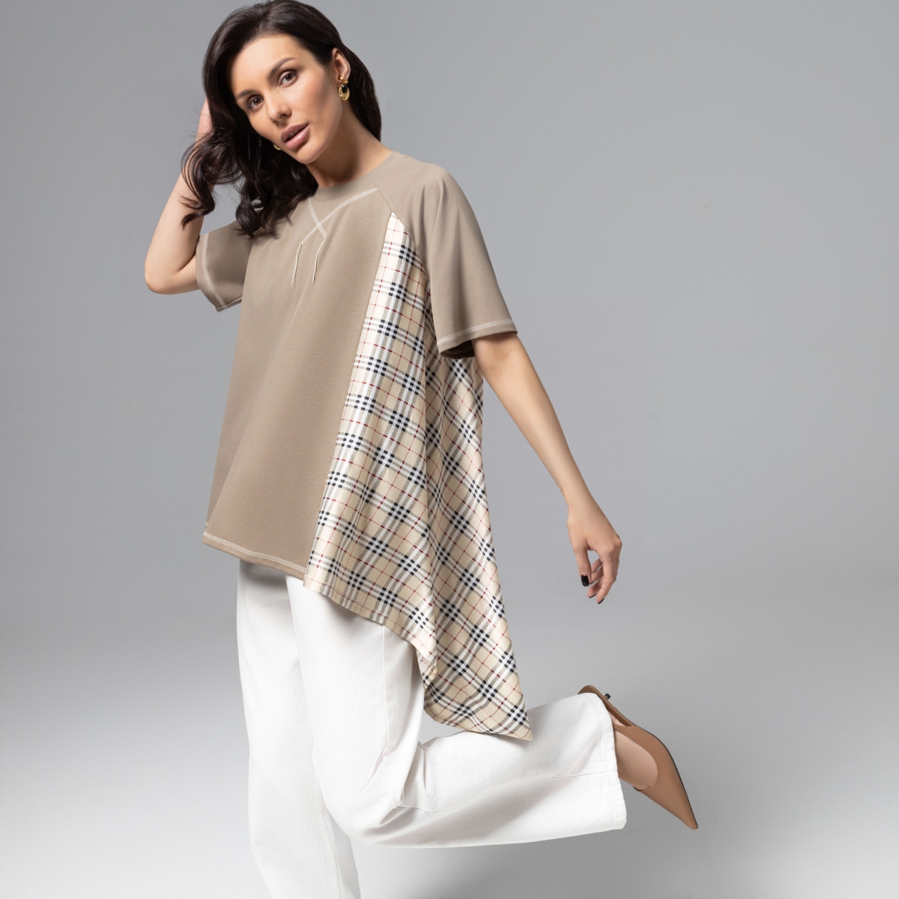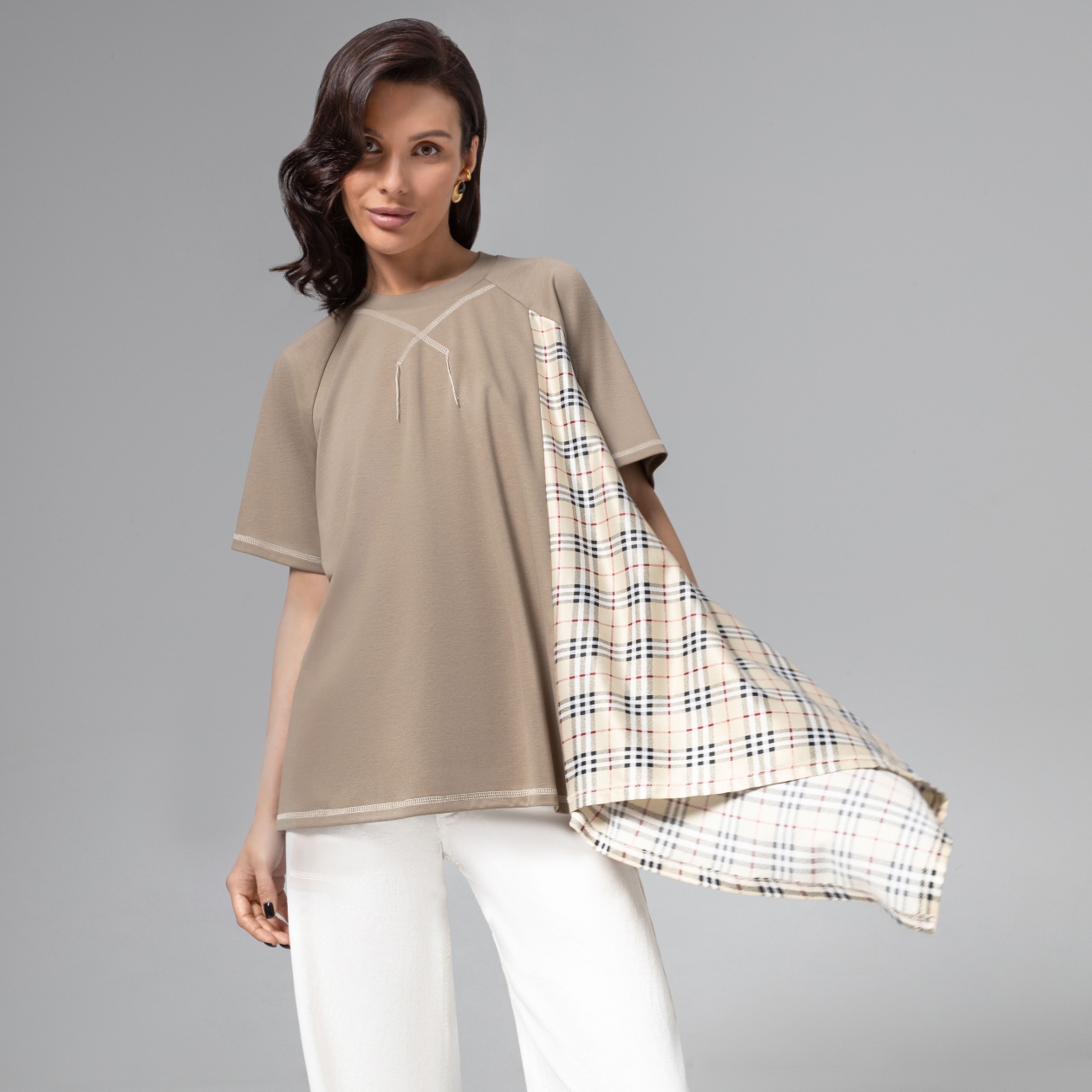 Футболка, как благородный предмет гардероба? Да! Если это изделие от CHARUTTI. Высокий стиль и готовность стать компаньоном для праздничных летних выходов – это все о футболке коллекции PREMIUM. Футболка свободного кроя. Акцентные строчки с распущенными нитями в качестве декора. Вставка удлиненная, асимметричного кроя, из контрастного материала.