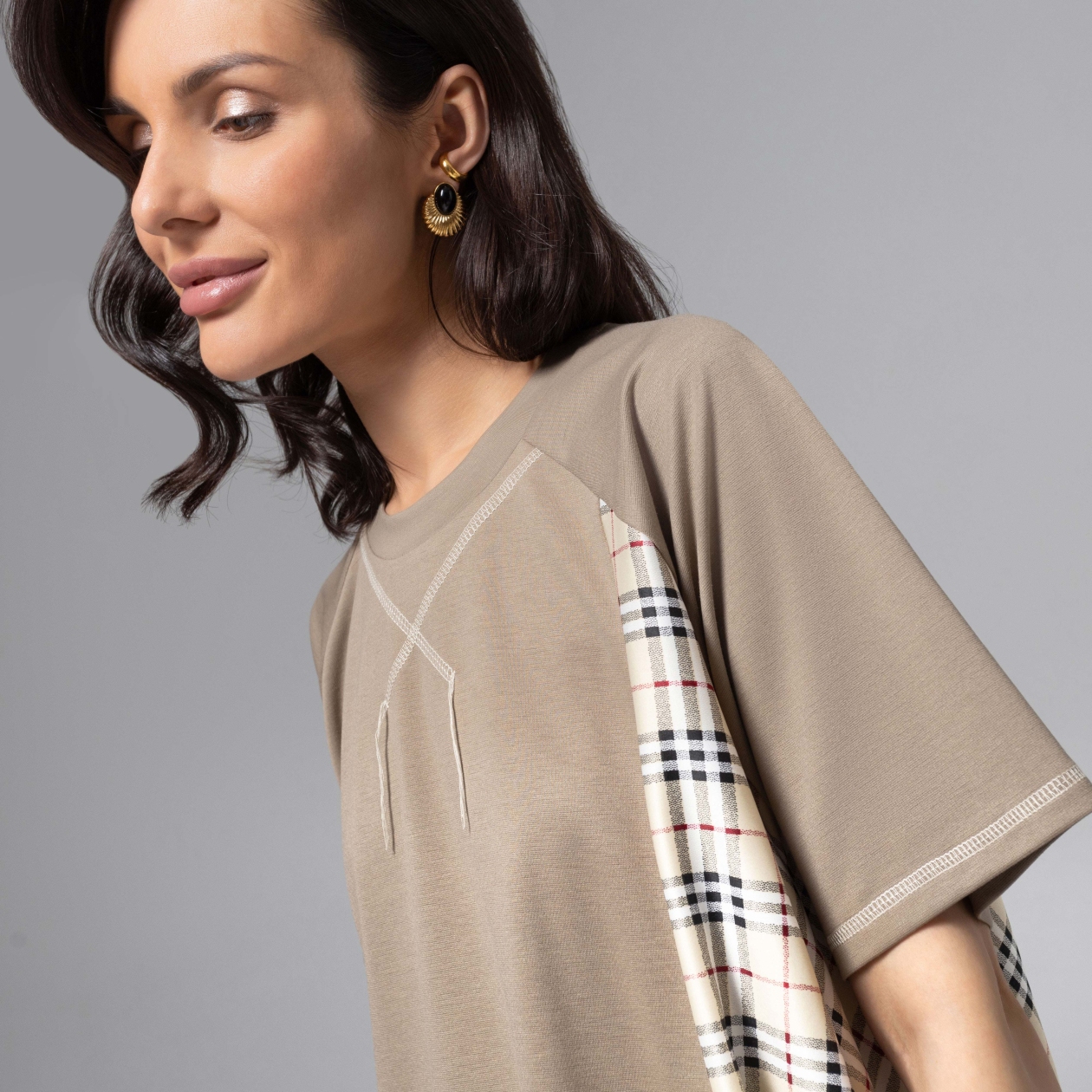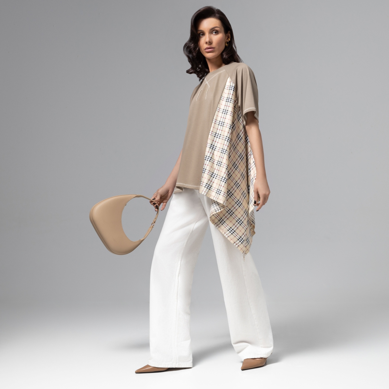 Футболка, как благородный предмет гардероба? Да! Если это изделие от CHARUTTI. Высокий стиль и готовность стать компаньоном для праздничных летних выходов – это все о футболке коллекции PREMIUM. Футболка свободного кроя. Акцентные строчки с распущенными нитями в качестве декора. Вставка удлиненная, асимметричного кроя, из контрастного материала.
