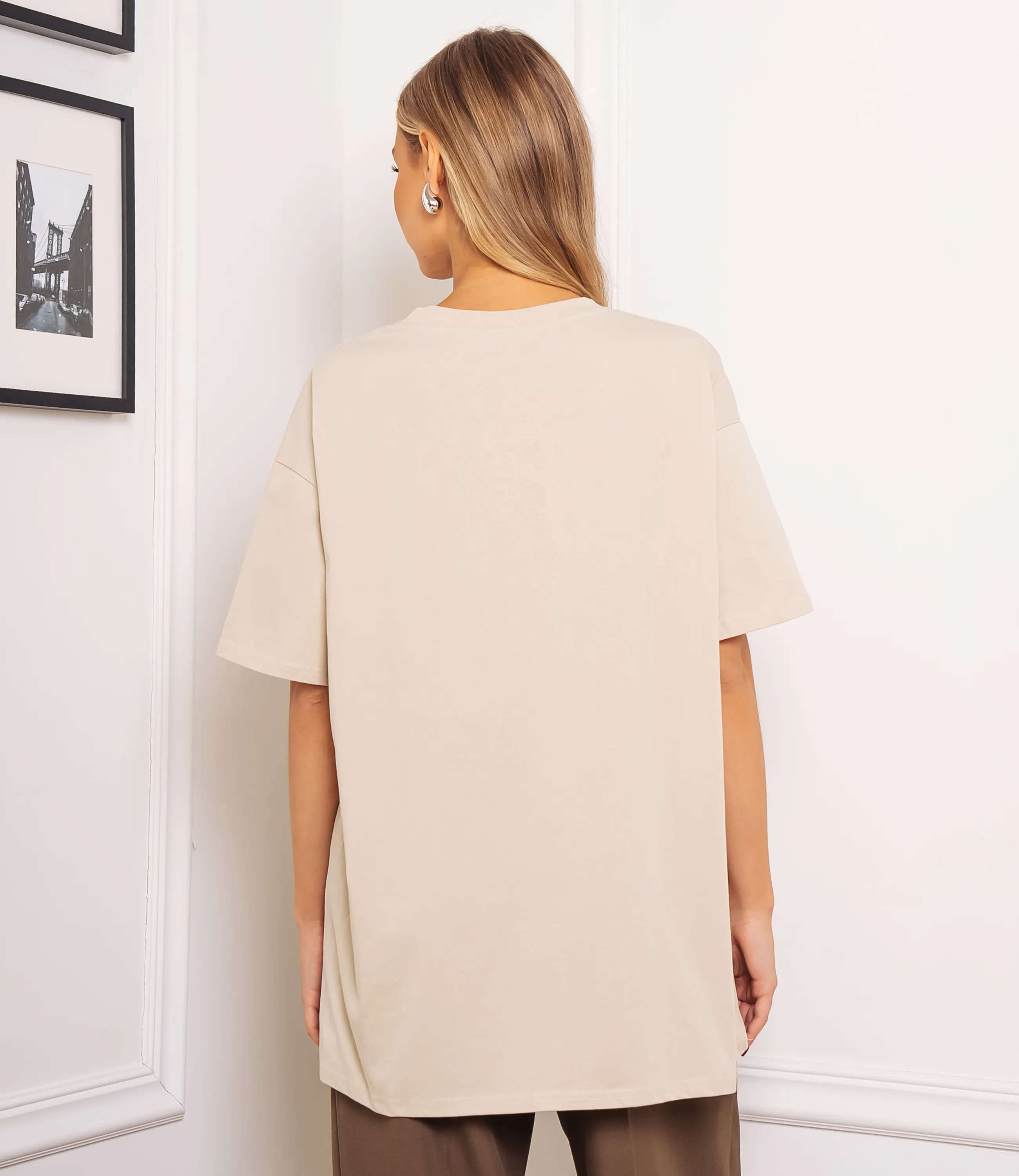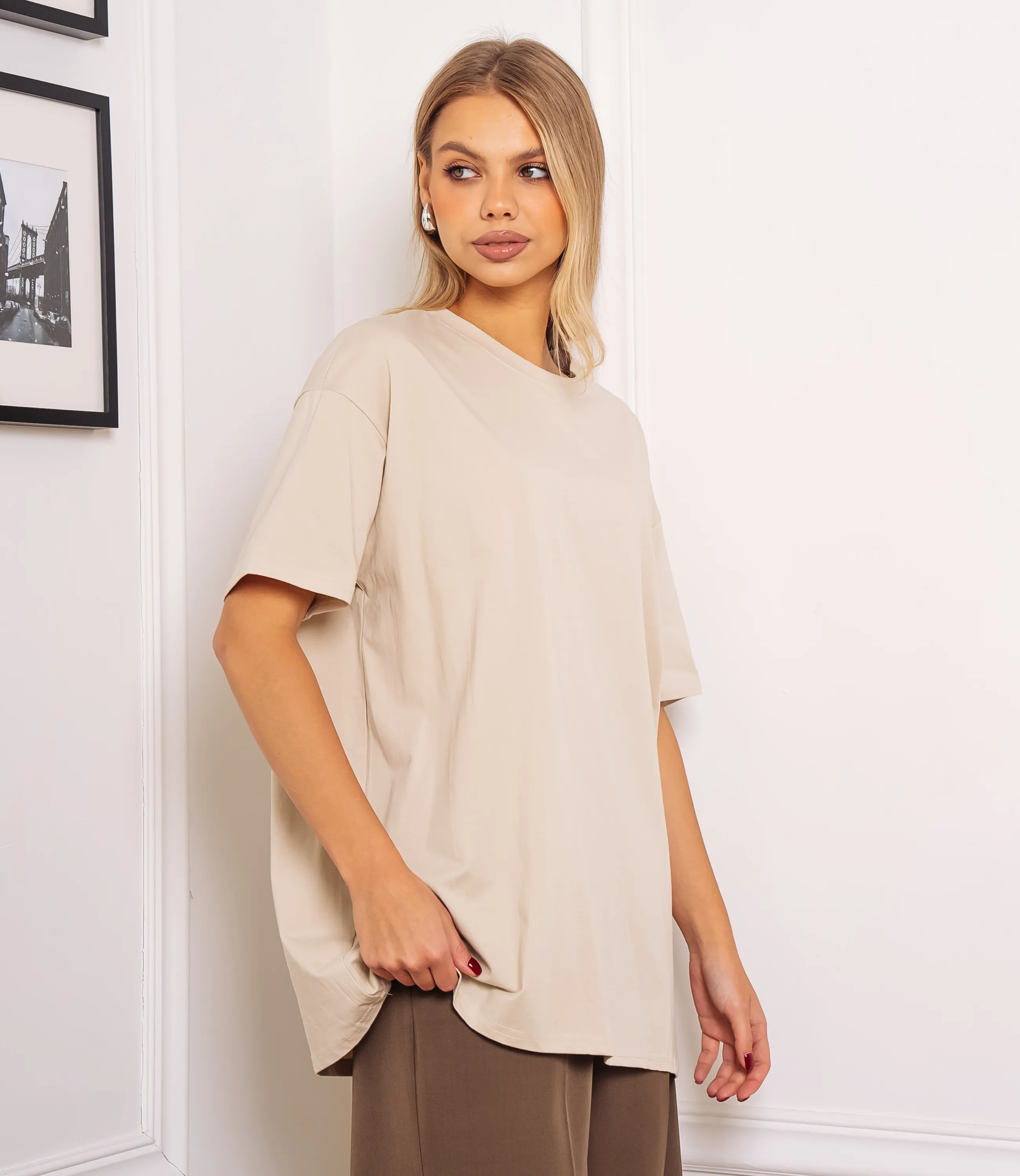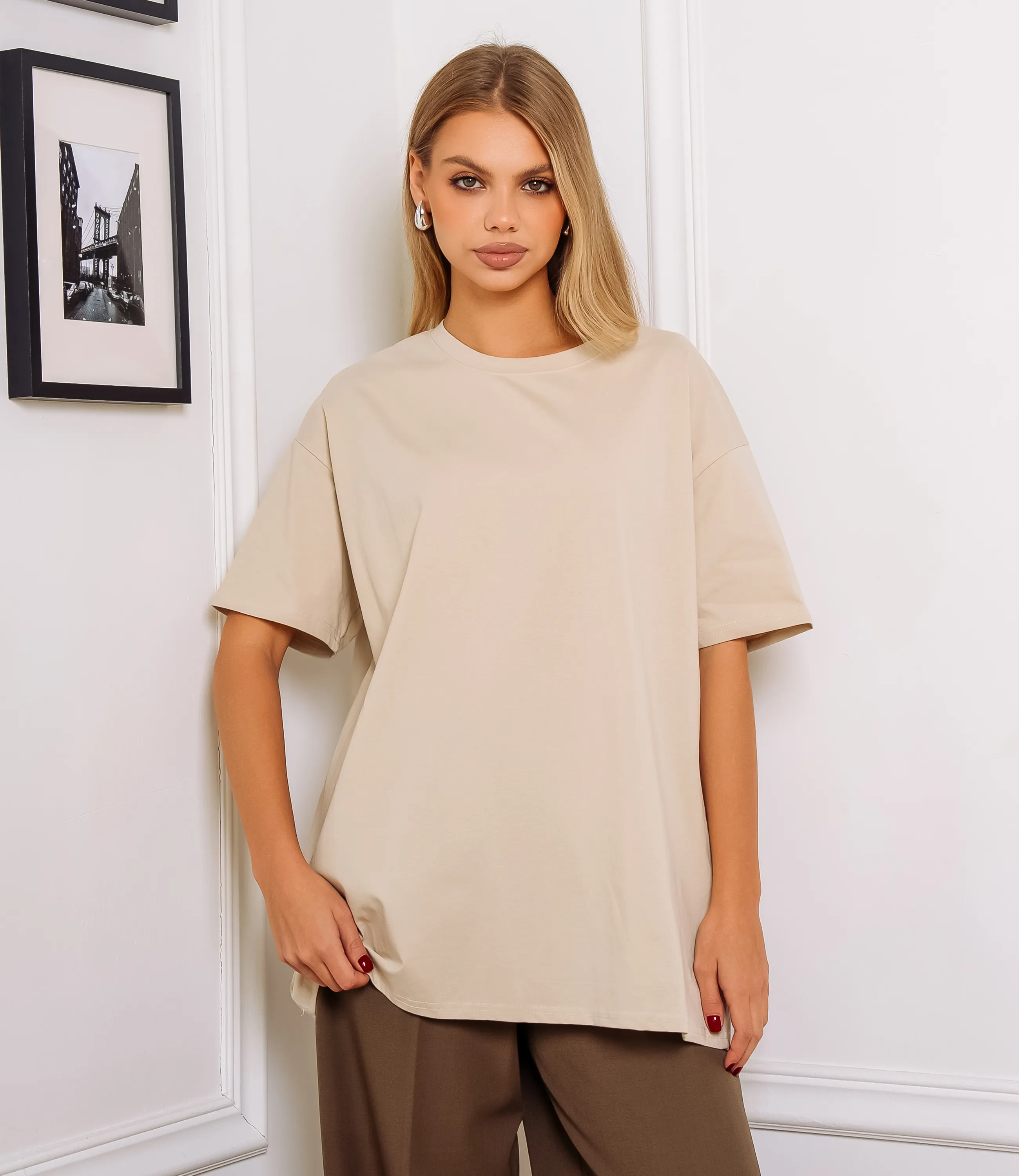 Эта футболка — прекрасный выбор для вашего магазина, предлагая стильный и универсальный дизайн, который станет отличным дополнением к гардеробу ваших клиентов. Свободный стиль, который обеспечивает комфорт и свободу движений. Широкие рукава и удлиненная форма делают футболку универсальной для различных нарядов. Классический круглый вырез горловины, который подходит практически всем типам фигур. Выполненная из 23% хлопка, 27% полиэстера, футболка обеспечивает отличное качество и приятные тактильные ощущения. Независимо от сезона, она станет любимым элементом в гардеробе ваших клиентов. На странице сайта доступна таблица размеров, что позволит вашим покупателям легко найти подходящий вариант. Установленная цена делает эту футболку доступной для широкой аудитории, что обеспечит вам высокий уровень продаж. Рост модели: 168, параметры: 89-63-90.