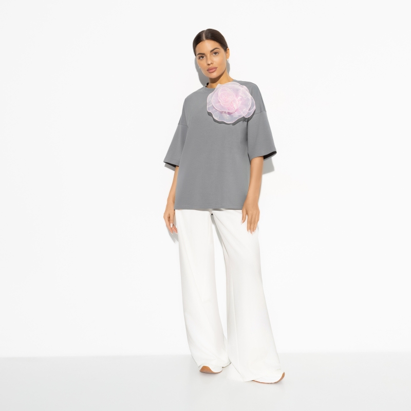 Лайфхак от CHARUTTI на случай важного разговора. Выбирайте футболку свободного кроя в сером цвете, чтобы убедить собеседника в своей правоте. В случае положительного исхода разговора, надевайте огромную нарядную розовую брошь, как символ победы. Футболка в стиле oversize удлиненная. Брошь в розовом цвете съемная.