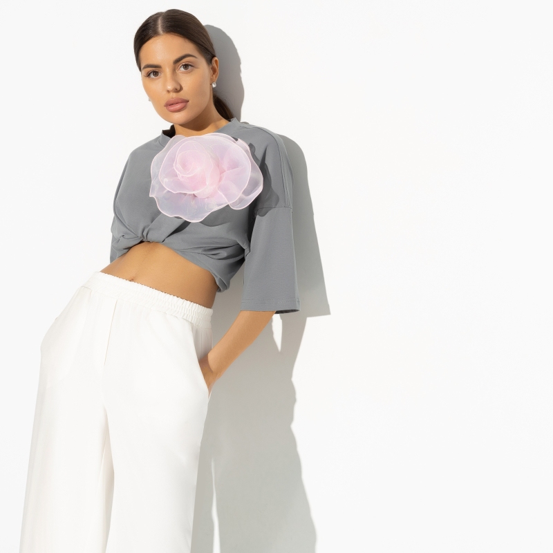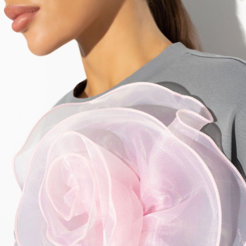 Лайфхак от CHARUTTI: если вас ждет важный разговор, выбирайте футболку свободного кроя в сером цвете, чтобы убедить собеседника в своей правоте. В случае положительного исхода разговора, надевайте огромную нарядную розовую брошь, как символ победы. Футболка в стиле oversize удлиненная, что добавляет ей дополнительную универсальность и делает её идеальной для оптовых закупок. Брошь в розовом цвете съемная, что позволяет легко менять стиль в зависимости от ситуации.