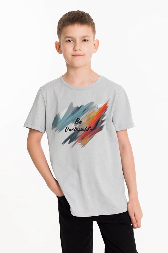 Футболка выполнена из однотонной кулирки. Горловина с круглым вырезом, оформленным бейкой, спереди нанесен принт.