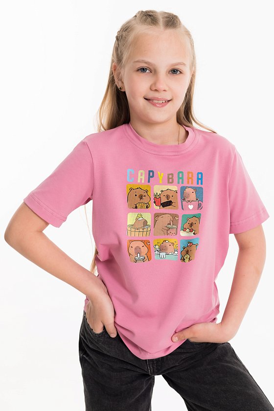 Футболка детская, с коротким рукавом и округлым вырезом горловины, оформленным планкой. Спереди на футболке нанесён оригинальный принт.