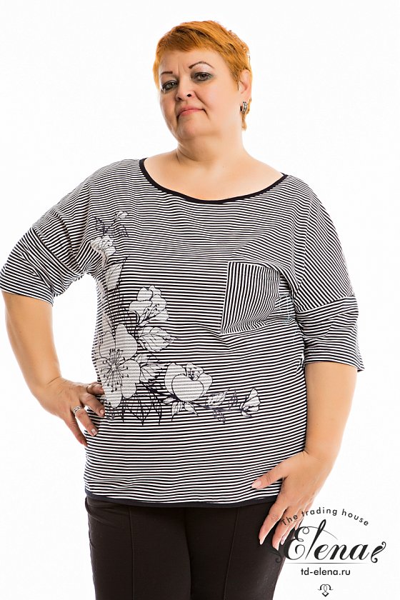Женская тельняшка с принтом и коротким спущенным рукавом. Спереди расположен карман с вертикальным направлением полоски. Горловина и низ тельняшки обработаны однотонной отделочной бейкой.