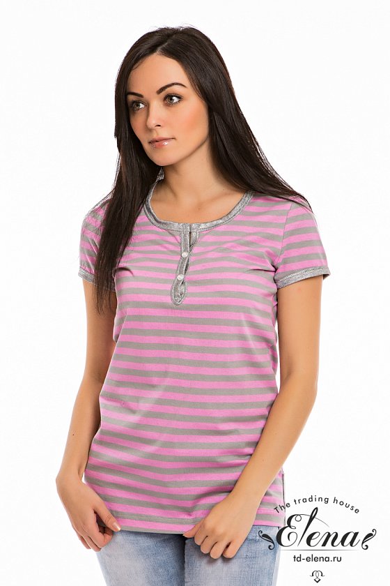 Футболка выполнена из кулирного полотна с набивкой в полоску. Рукав короткий, горловина имеет круглый вырез с имитацией планки с застежкой на пуговицы. В качестве отделки рукава и горловина изделия обработаны бейкой серебристого цвета из вискозы.
