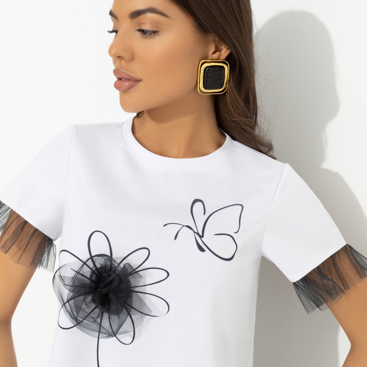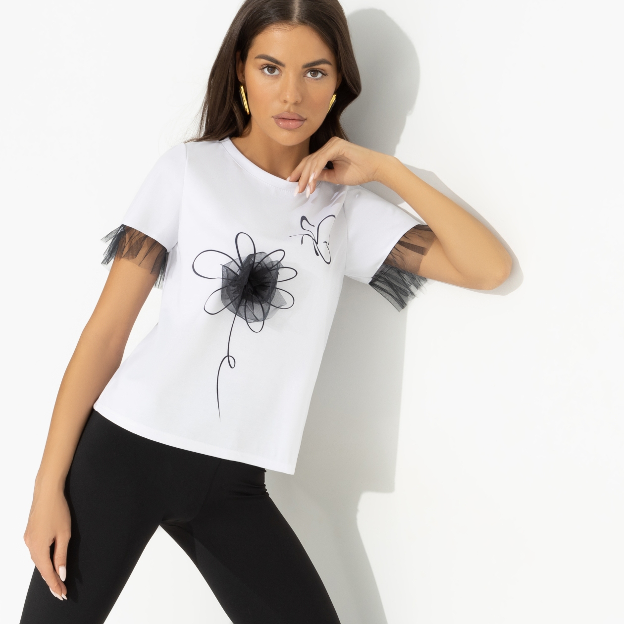 Футболка, которая говорит за тебя: да, я утончённая, но попробуй предсказать мой следующий шаг! Белая база + сетчатый декор = формула стиля, которой никто не сможет повторить. Футболка классического силуэта, чуть укорочена. Рюши из сетчатой ткани вшиты. Объемный декор на передней стороне изделия вшит. Принт напечатан на ткани.