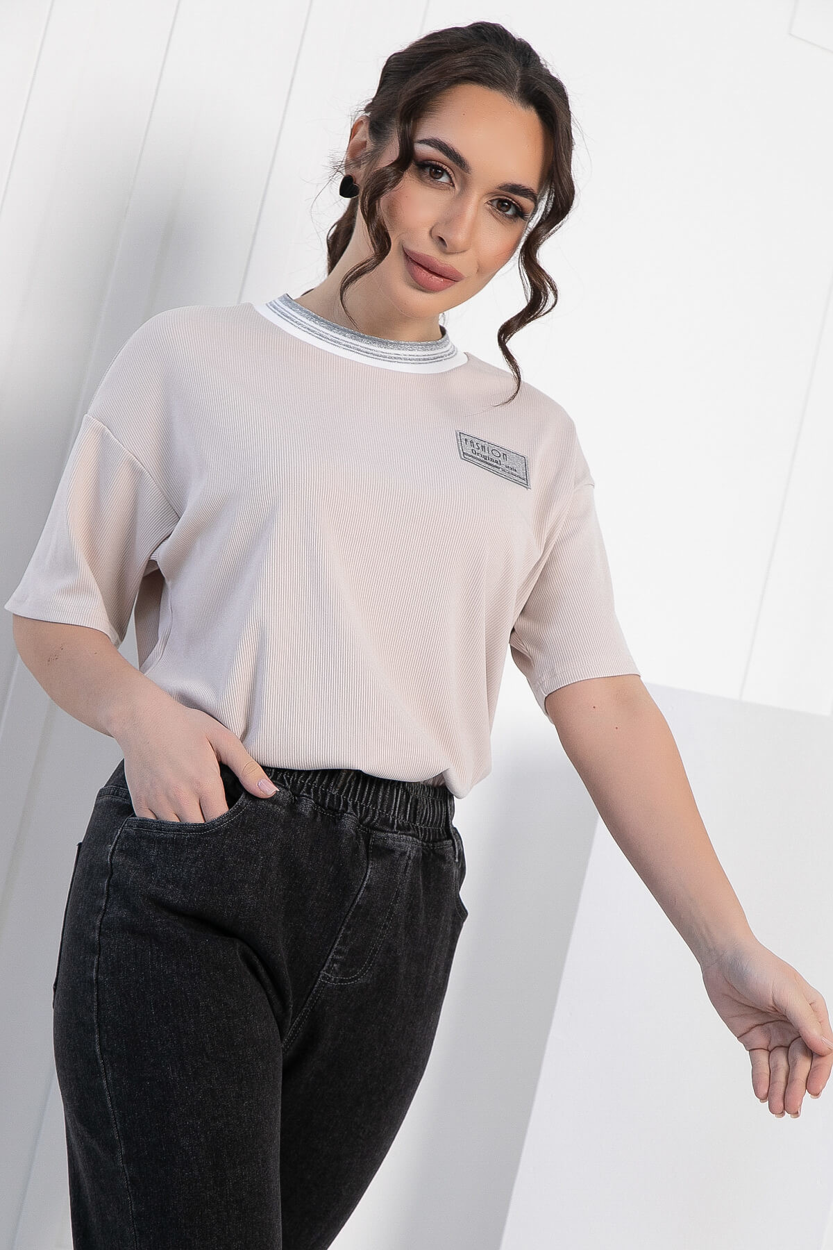 Футболка из трикотажа "Лапша" идеальный вариант на каждый день! Изделие украшает нашивка спереди на груди. Рукав укороченный, со спущенным плечевым швом. Идеально смотрится с джинсами и с брюками. Акцентный воротник придает особый шарм!