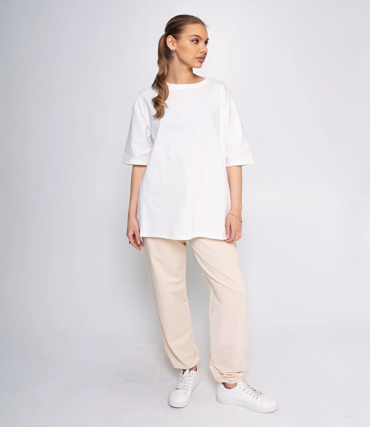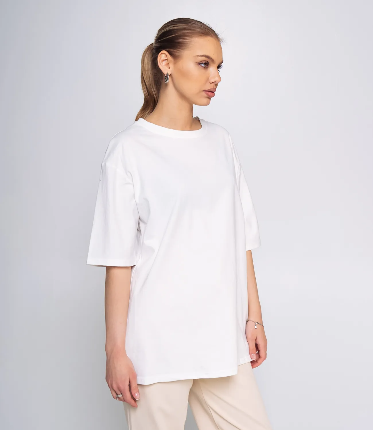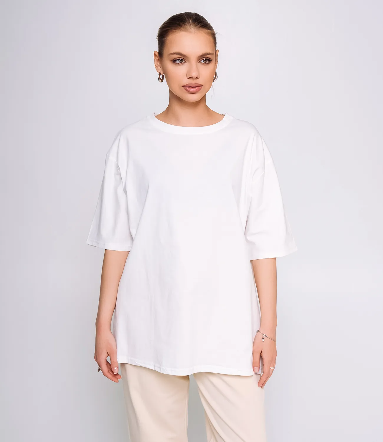 Эта футболка — прекрасный выбор для вашего магазина, предлагая стильный и универсальный дизайн, который станет отличным дополнением к гардеробу ваших клиентов. Свободный стиль, который обеспечивает комфорт и свободу движений. Широкие рукава и удлиненная форма делают футболку универсальной для различных нарядов. Классический круглый вырез горловины, который подходит практически всем типам фигур. Выполненная из 95% хлопка, 5% эластан, футболка обеспечивает отличное качество и приятные тактильные ощущения. Независимо от сезона, она станет любимым элементом в гардеробе ваших клиентов. На странице сайта доступна таблица размеров, что позволит вашим покупателям легко найти подходящий вариант. Установленная цена делает эту футболку доступной для широкой аудитории, что обеспечит вам высокий уровень продаж. Рост модели: 168, параметры: 89-63-90.
